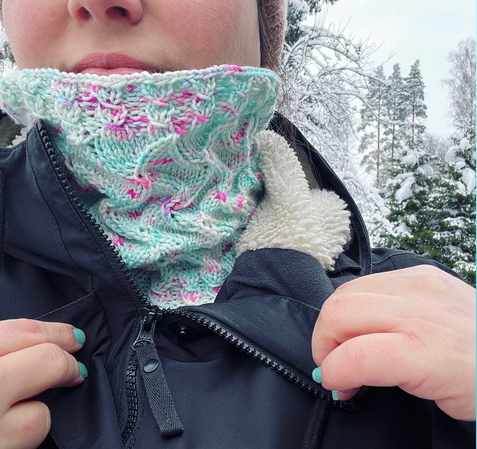Aaltoileva kuvio antaa tuubihuiville pehmeän ilmeen. Ohje sopii hyvin sekä aloittelijoille että kokeneemmille neulojille. Huivi toimii myös erinomaisesti lämpimänä lahjana läheisille.
