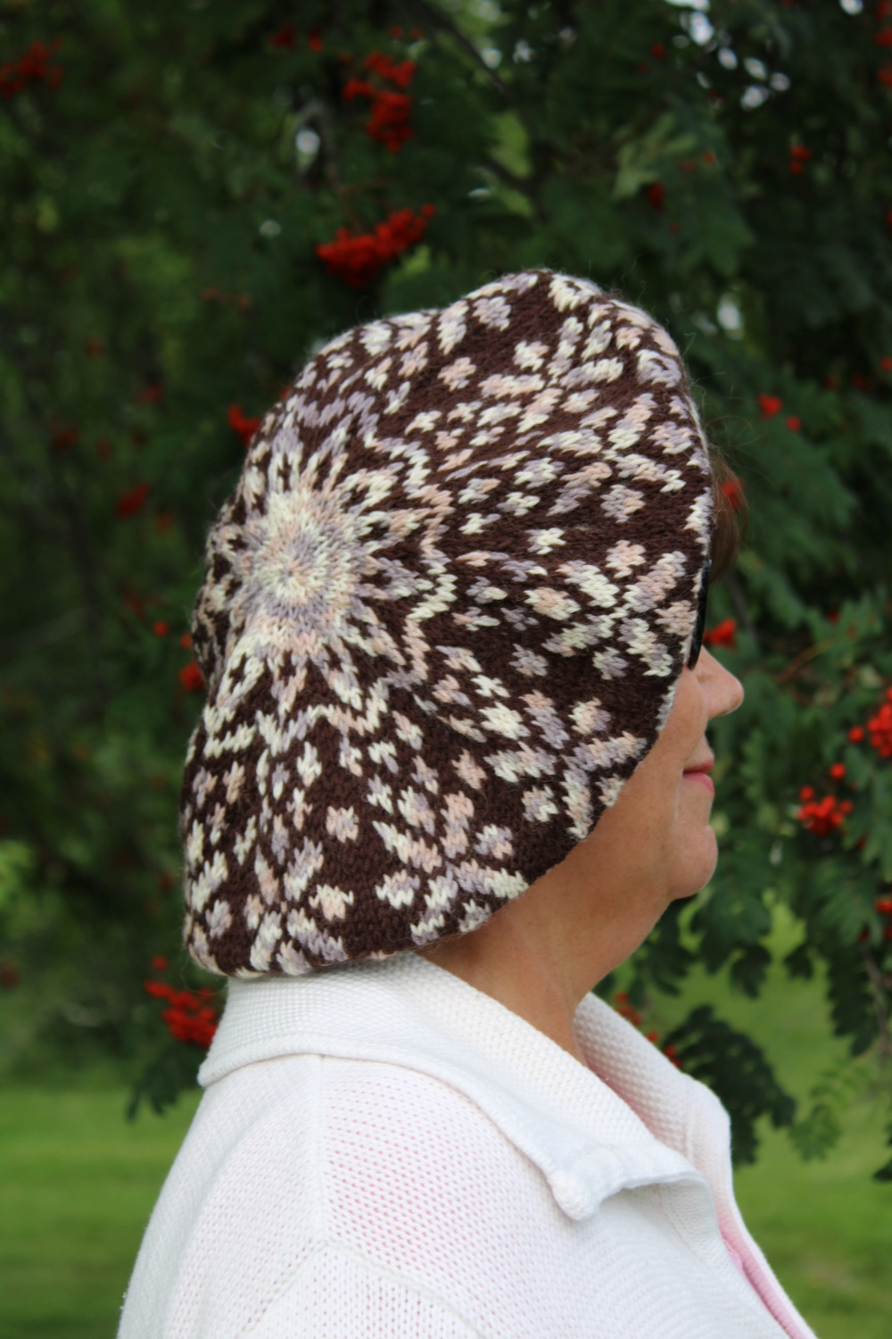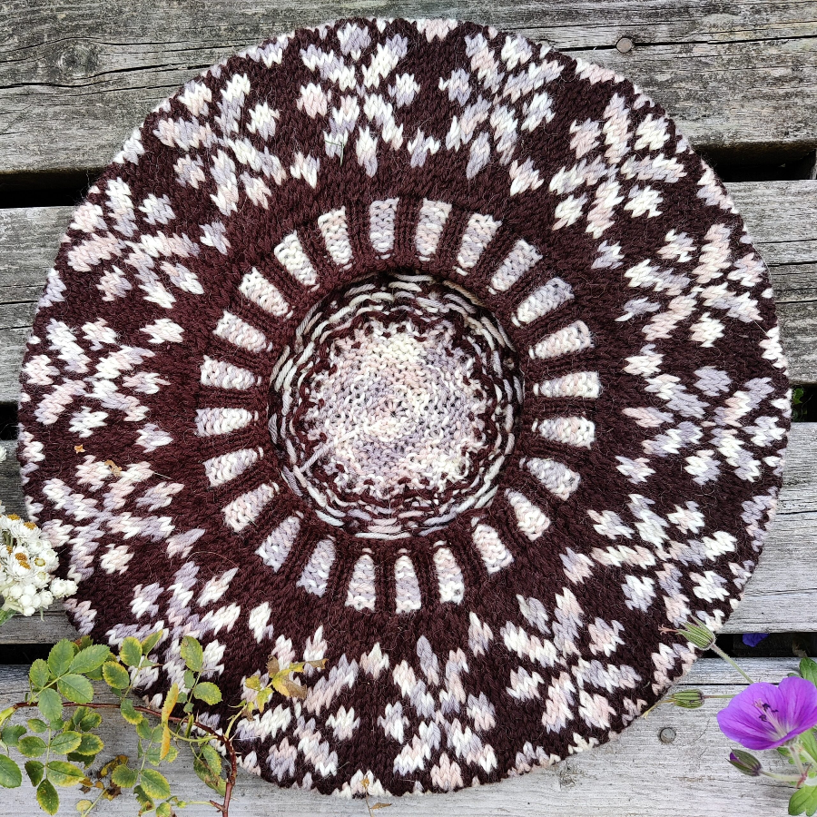 Ambrosia baskeri on huomattavasti suurempi reunainen, kuin tavalliset baskerit. Sen saa muotoiltua sopivasti sivulle tai taakse, oman maun mukaan. Ambrosia neulotaan joustinneuleesta kohti päälakea.