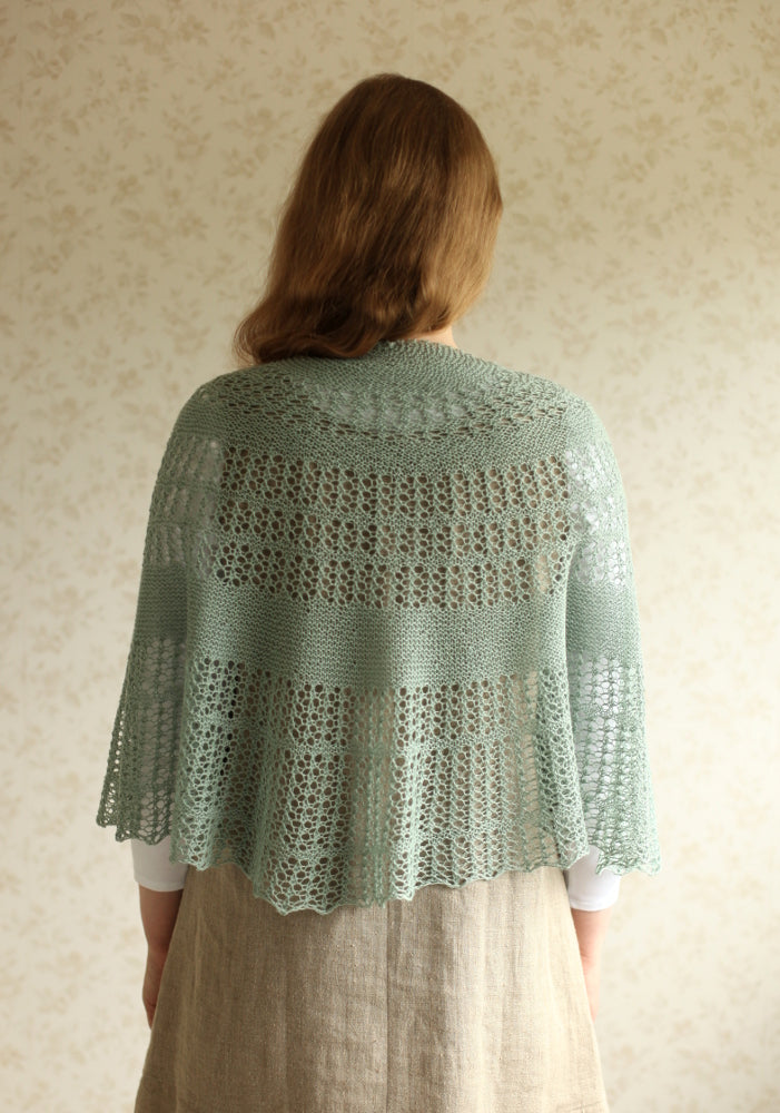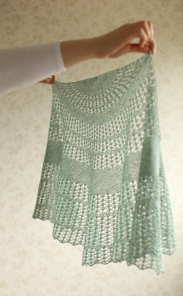 Auer on niskasta aloitettava puoliympyrän muotoinen huivi. Siinä vuorottelevat aina oikein neulotut raidat ja yksinkertainen pitsi.