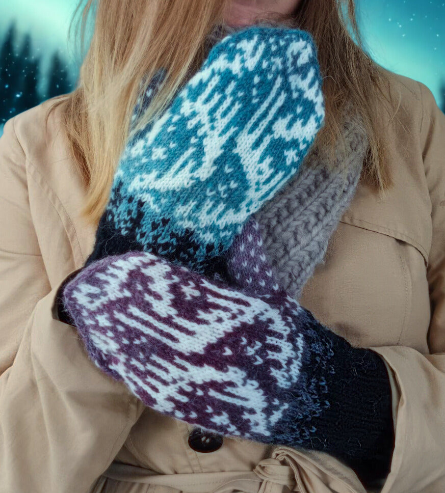 Myös sukissa ja pannassa hehkuneet revontulet löytyvät nyt lapasistakin. Taivaan tulien loimua mukailee liukuvärjätty lanka, jolla voit leikitellä lapasparissa.