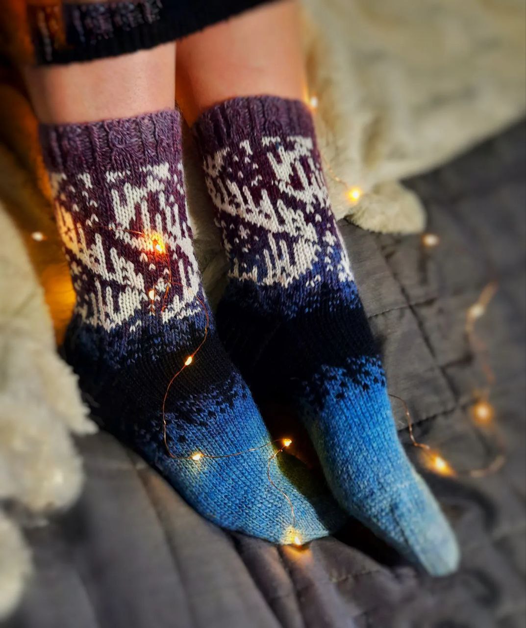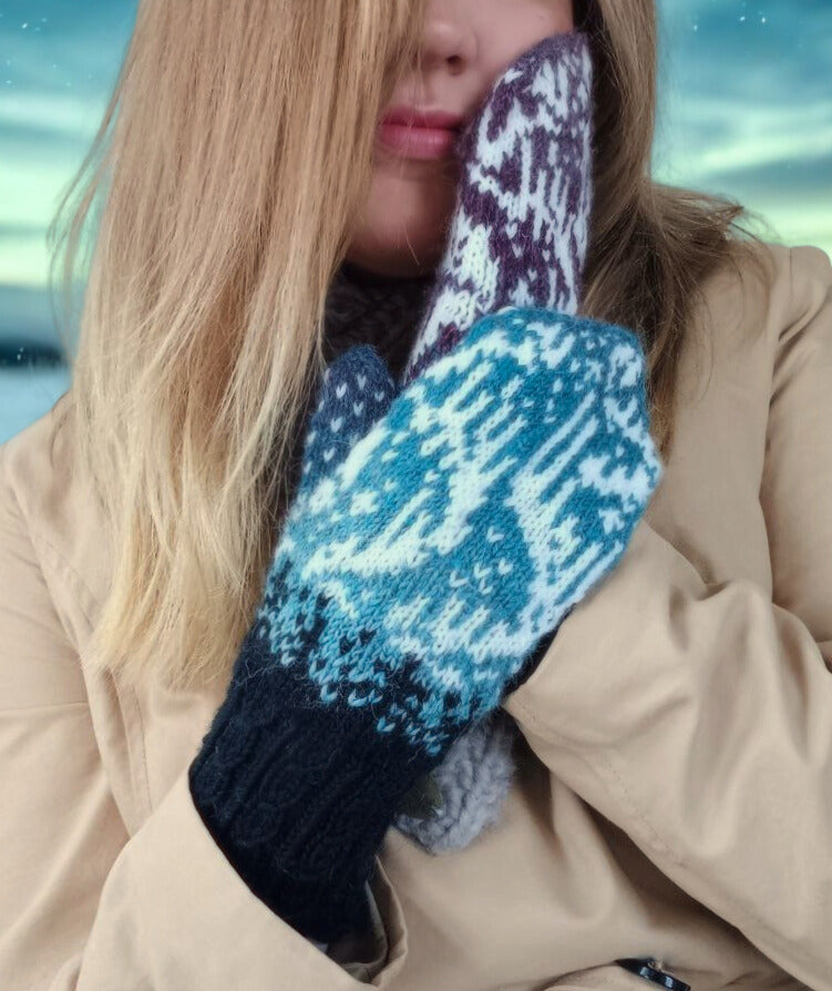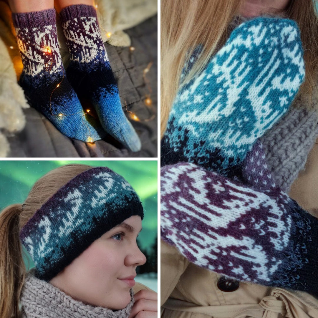 Auroora-neulepaketti sisältää kolme erillistä ohjetta. Kaikki samalla revontulikuviolla luodut asusteet samassa paketissa. Ohjepaketti sisältää ohjeet sukkiin, lapasiin ja pantaan.