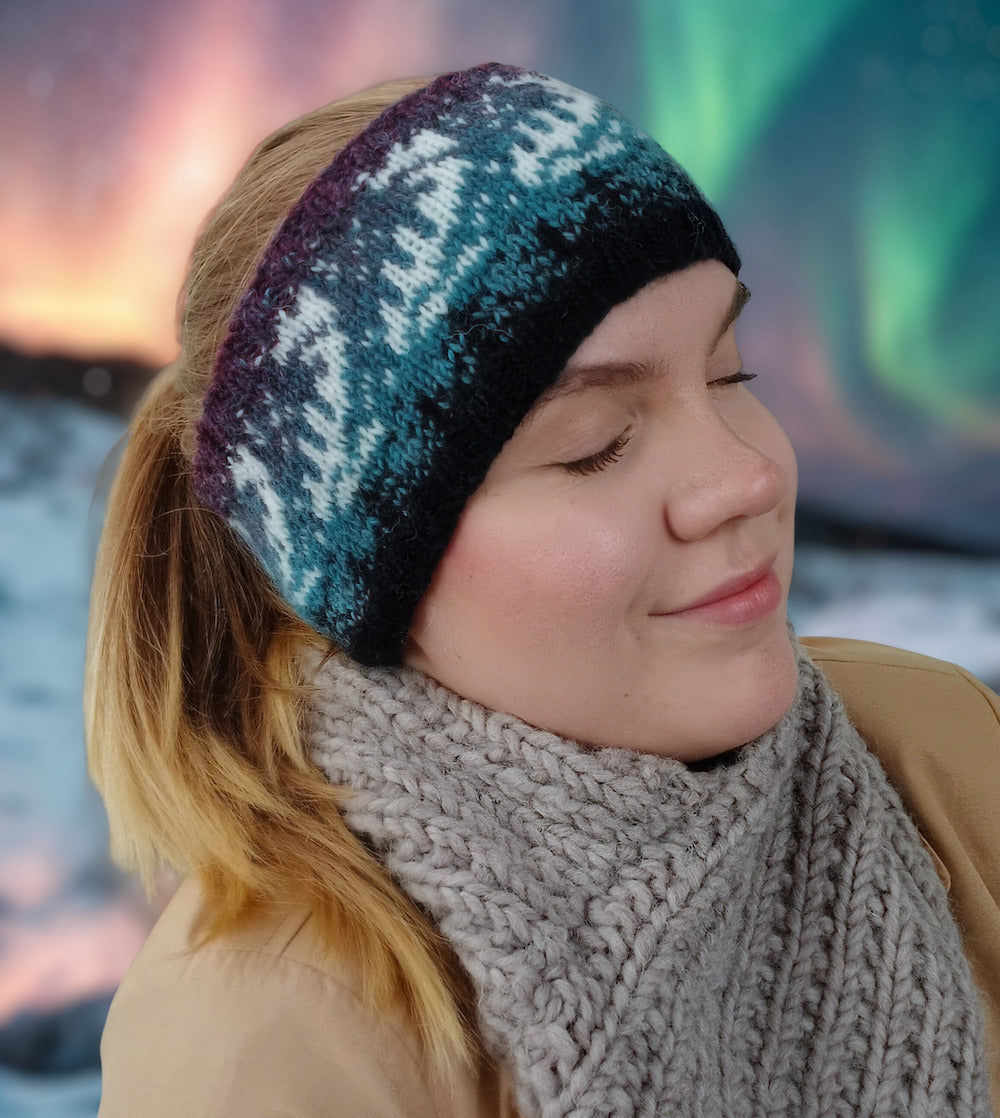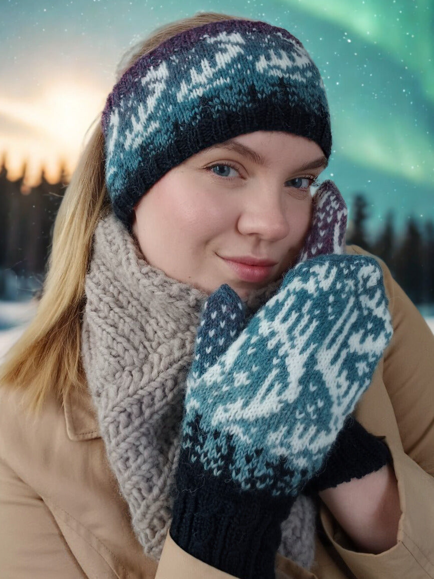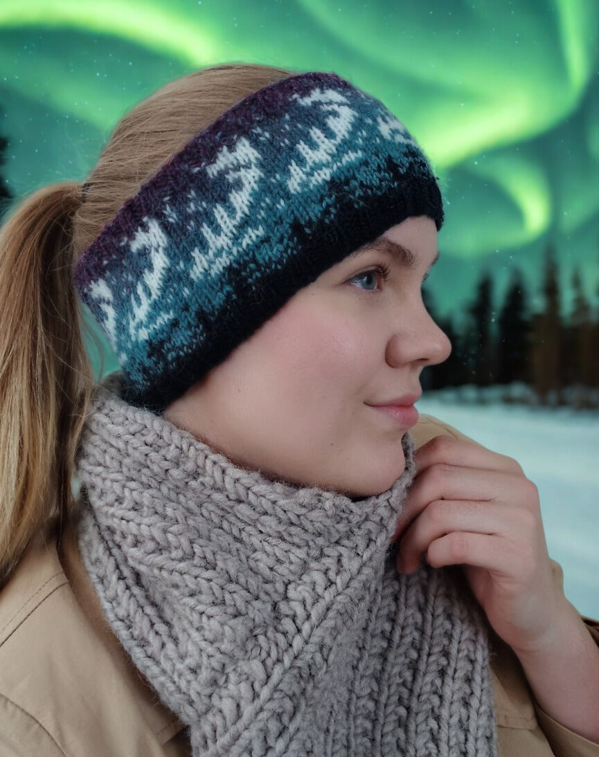Myös sukissa ja lapasissa hehkuneet revontulet löytyvät nyt pannastakin. Taivaan tulien loimua mukailee liukuvärjätty lanka ja öistä metsää alaosan mustat puukuviot.