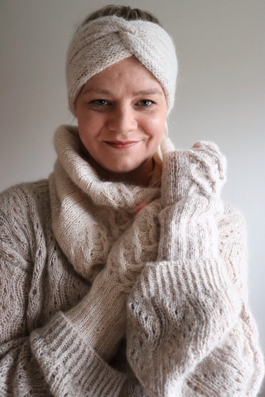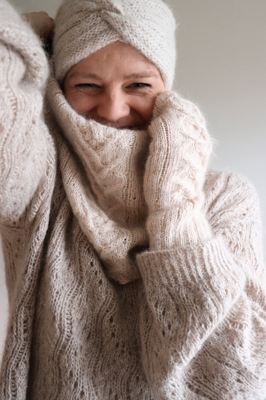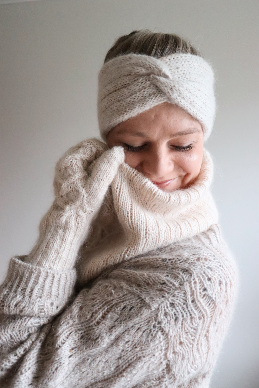 Jokaisen naisen unelmasetti, joka sisältää kämmekkäät, lapaset, tuubihuivin sekä pipon ja pannan.