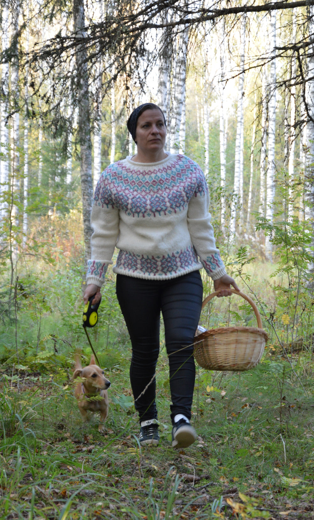 Neulotaan alhaalta ylös kolmella värillä. Kuviot helmassa ja hihansuissa, sekä kaarrokkeessa.