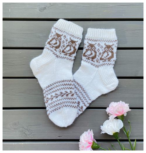 Koko: nainen 39/40, jalkaterän pituus muokattavissa helposti. Varren korkeus 9 - 11 cm riippuen valitsemastasi eläinkuviosta. Pienemmät sukat saat vaihtamalla puikot pienempiin, esimerkiksi 2,75