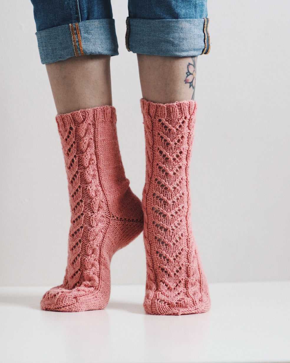Evelyn-sukat neulotaan varresta varpaisiin seuraamalla etuosassa kuviota kaavion mukaan. Helppo ja siisti tiimalasikantapää antaa kuvion loistaa.