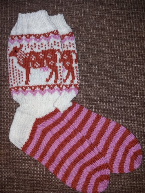 Farmilehmä kirjoneulesukat ohje (kuva Taina Huhtanen)