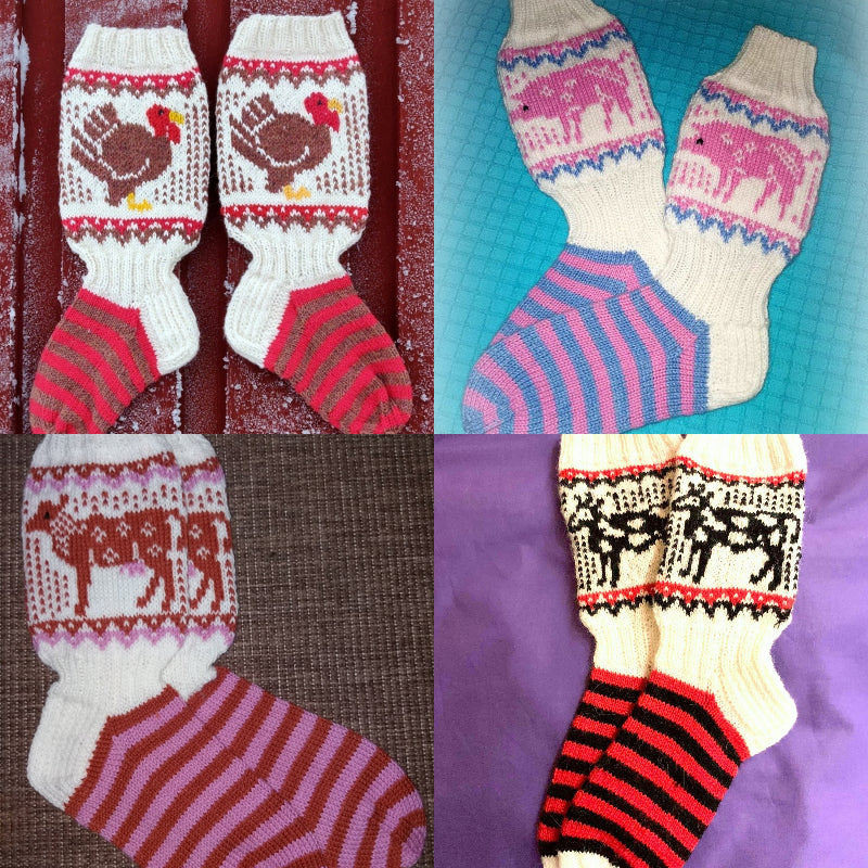 Farmisetti 2 sisältää ohjeet kirjoneulesukkiin farmikalkkuna, farmipossu, farmilehmä ja farmisonni.