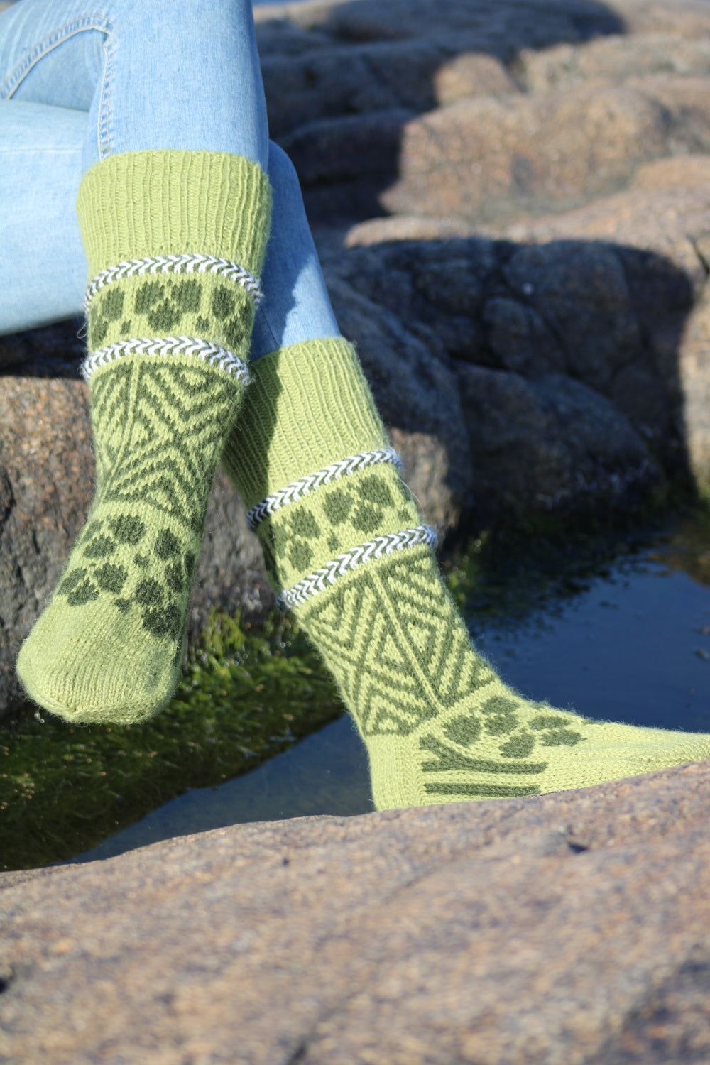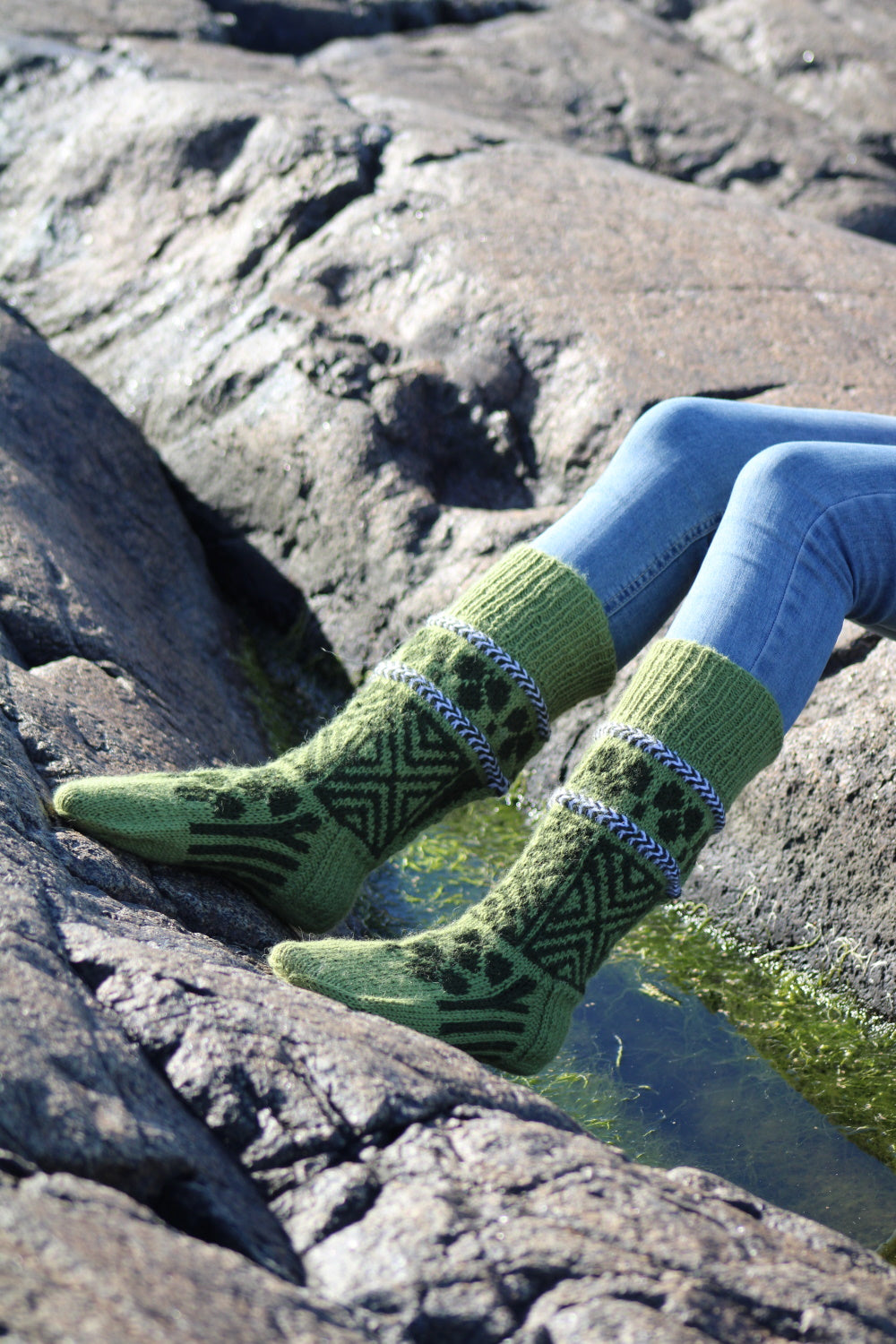 Koko: n.36-42, jalkaterän pituus muokattavissa, pohje normaalileveä suunnittelijan lanka- ja puikkovalinnoilla
