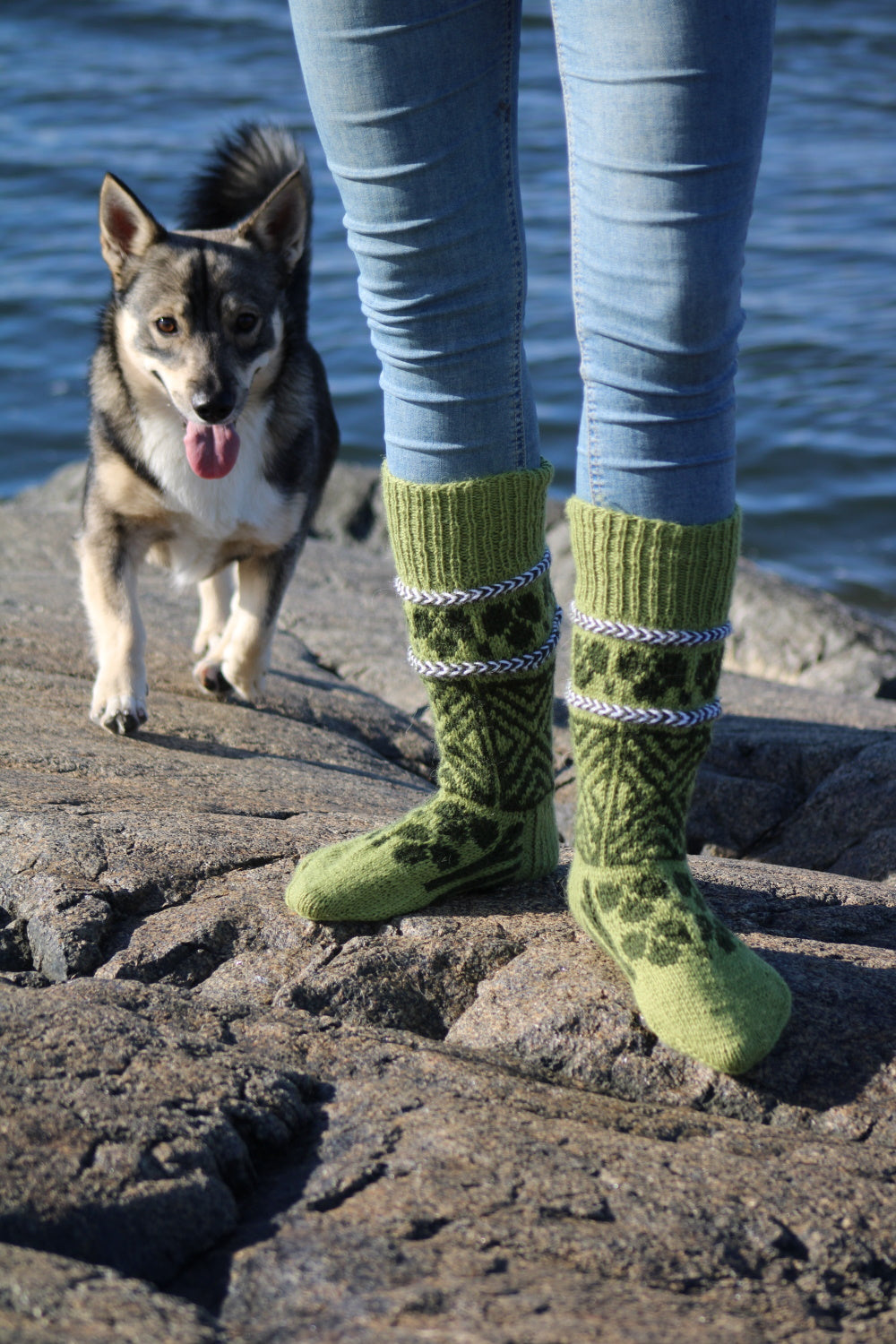 Fauni kirjoneulesukissa on metsän värit ja ryhtiä antamassa latvialaiset palmikot.