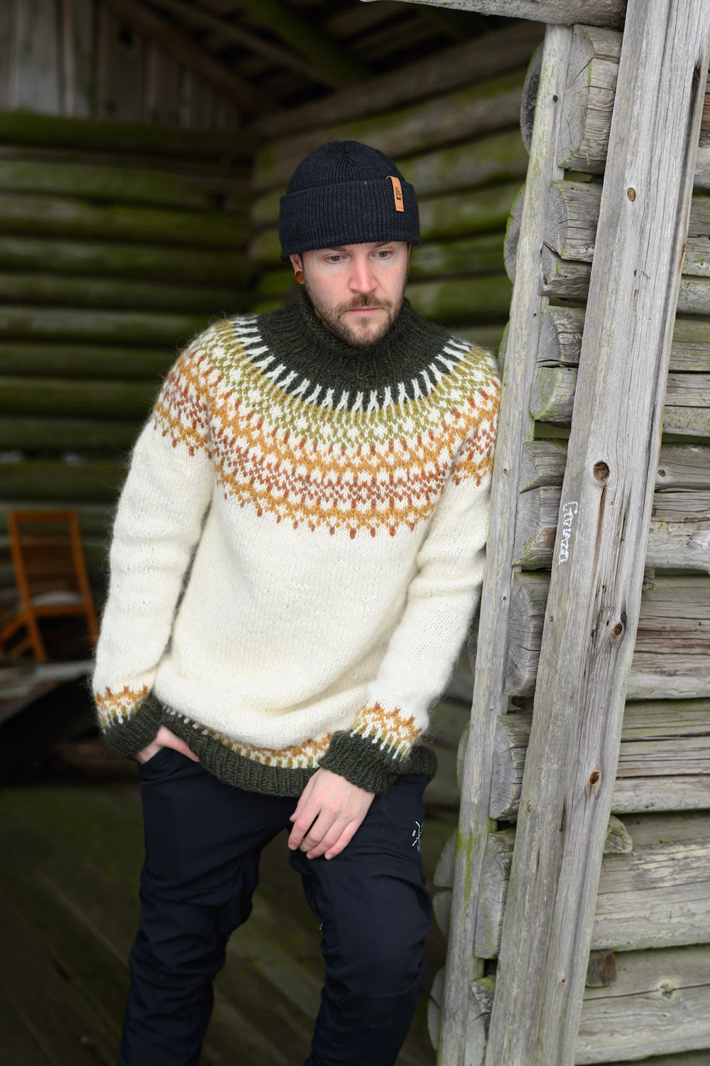 Alhaalta ylös neulottava kaarrokeneule. Kirjoneulekuvio on helppo, sillä siinä ei ole pitkiä langanjuoksuja ja kerroksella on vain kahta väriä kerrallaan. Pohjavärin lisäksi kuviossa on neljää eri kuvioväriä.