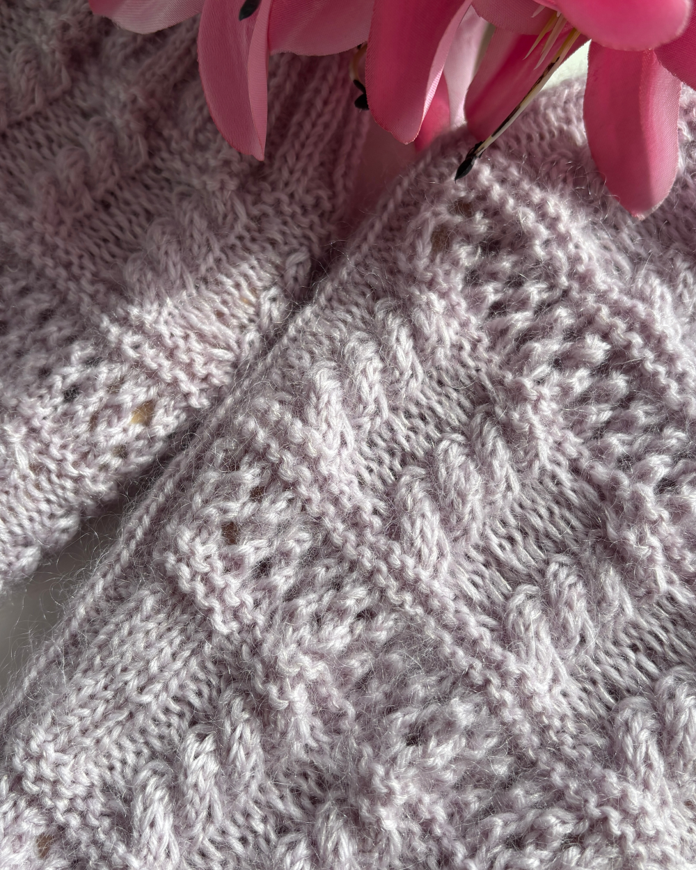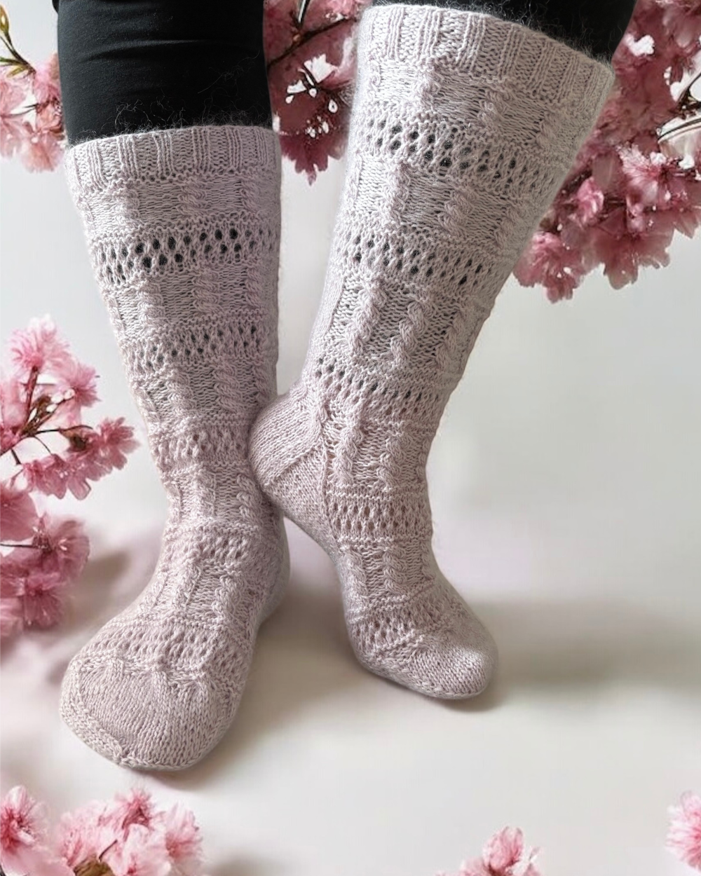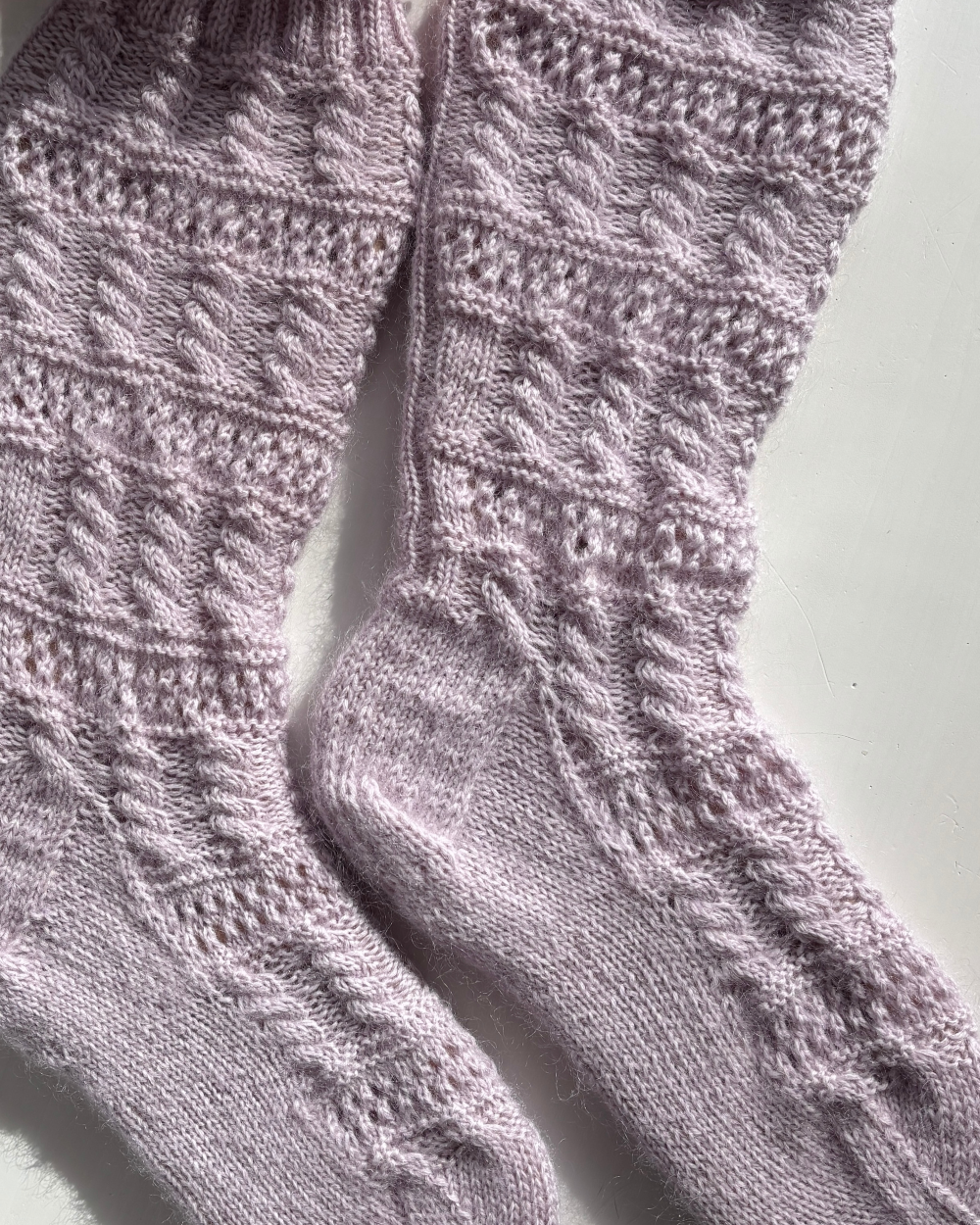 Lanka: Kuvan sukissa käytetyt langat ovat Filcolana Arwetta ja Filcolana Tilia värissä Delicate Orchid (278). Voit käyttää myös muuta fingering vahvuista lankaa (n. 400m/100g) ja yhdistää siihen valitsemaasi silkkimohairia tai muuta vastaavaa.