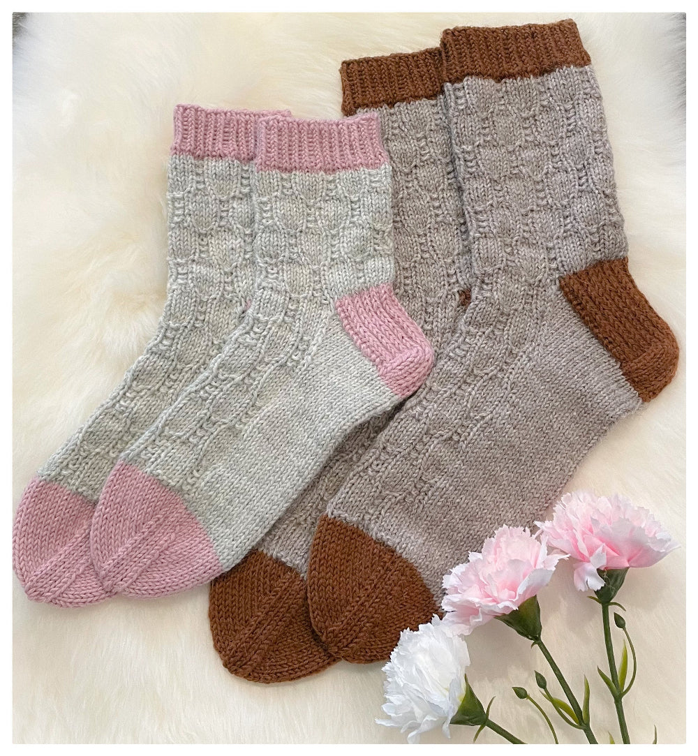 Helpot aloittelijallekin sopivat pintaneulesukat. Kuvio on helppo, mutta silti näyttävä. Koot naiselle ja miehelle.