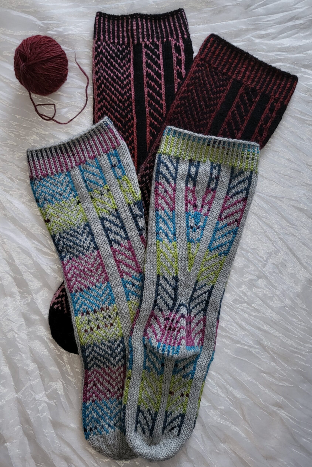 Graafi-villasukat neulotaan varresta varpaisiin kirjoneuleena. Kaksi eri pituutta varrelle.