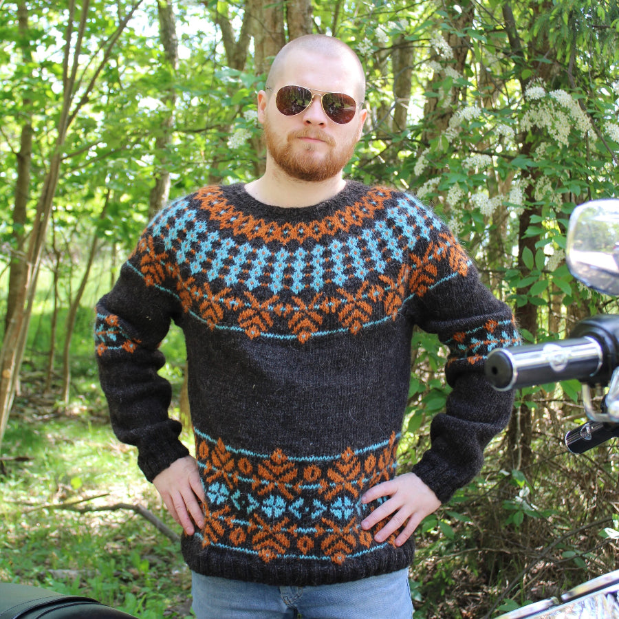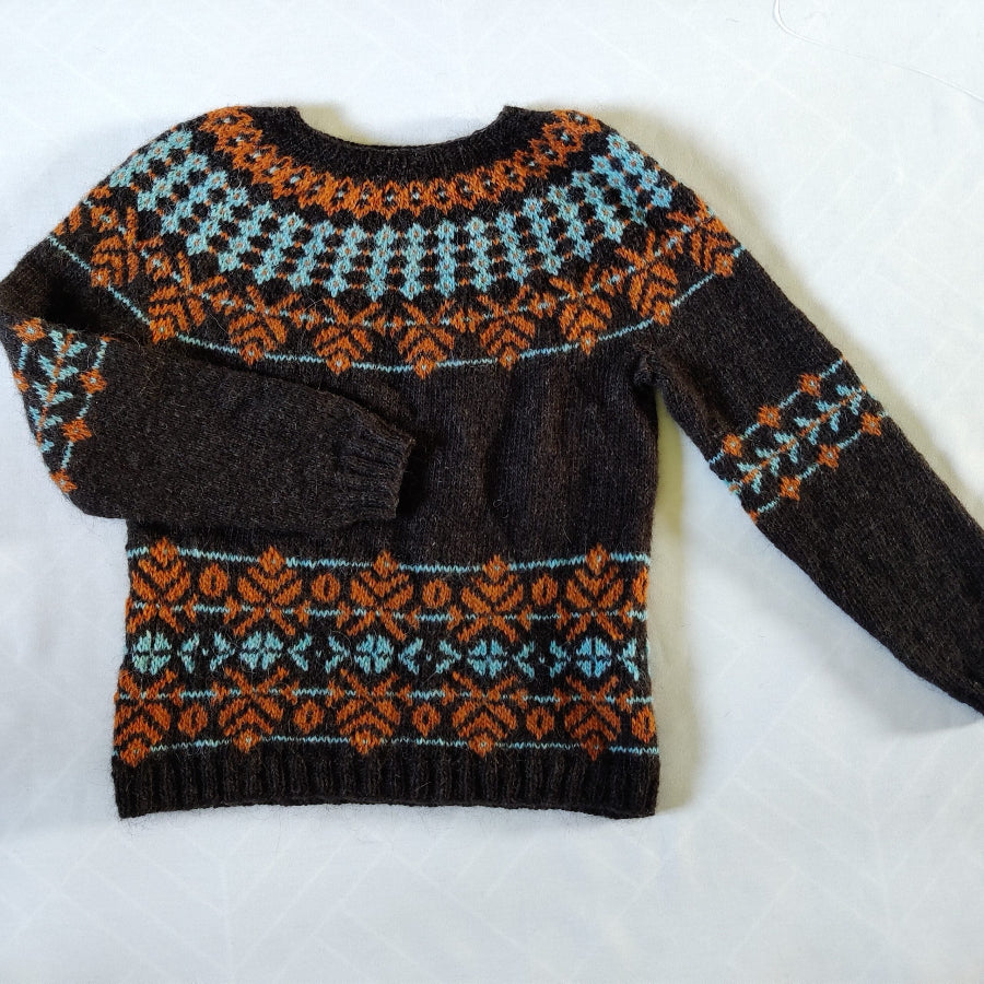 Neule neulotaan alhaalta ylöspäin, hihojen kuvio-osuus on hieman perinteisestä poiketen hihan yläosassa ja niskassa on korotettu takaosa. Lankana mallineuleessa on käytetty islantilaista Istex Lettlopi villalankaa, mutta aivan yhtä hyvin voit valita tilalle jonkin samanvahvuisen (100g = 200m) konepesun kestävän langan, kuten vaikka Lankavan Lystin.