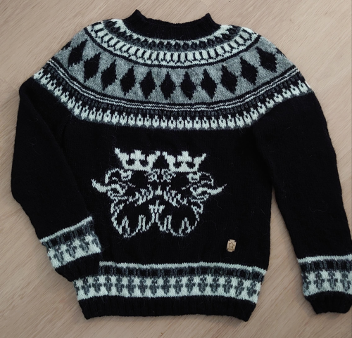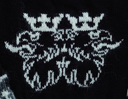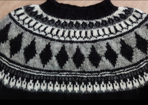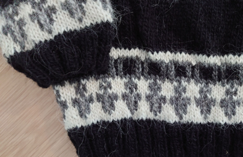 Vaikeusaste: Normaali/ Haastava; hieman silmukointia, kohtuullisen pituisia/ lyhyitä langanjuoksuja, max. 3 väriä samalla kierroksella. Etuosan isossa kuviossa pitkiä langanjuoksuja ja lankaa kuljetetaan vain kuvin kohdalla. Voi myös silmukoida jälkikäteen tai jättää kokonaan pois.