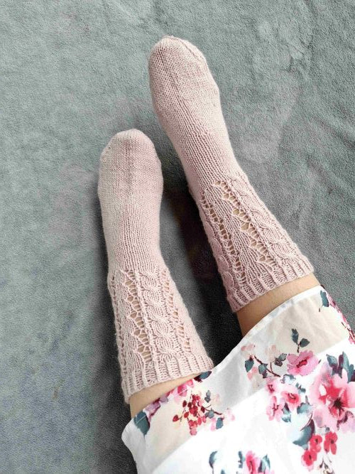 Helinä sukat ovat pitsiä ja palmikkoa sisältävät sukat, joissa on yksi koko varren leveyteen (noin 38-40) ja jalkaosaa voit neuloa omaan jalkaan sopivaan mittaan. (Ohjeessa on suuntaa antava sukkien kokotaulukko. Helinä pitsipalmikkosukat neulotaan noin sportvahvuisesta langasta (50 g = 170 m, kuvan sukat neulottu Drops Nord langalla) ja ne ovat ihanan kevyet sukat kevääseen ja kesään. Herkkä pitsikuvio tuo varteen ihanan herkän tunnelman. Sukkaparin saa neulottua 100 g langalla. Kuvan sukat on neulottu 3 mm puikoilla. Ohje on kirjoitettu sukkapuikoille ja sukat neulotaan varresta varpaisiin.