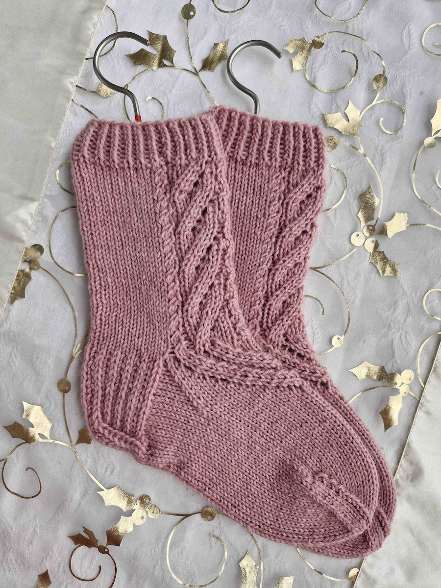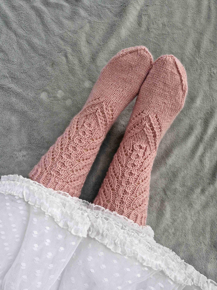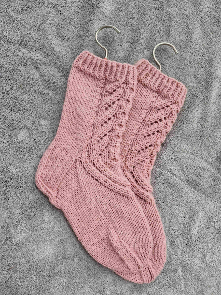 Hento-sukissa on sekä pientä palmikkoa, että pitsiä varressa. Jalkaosassa neulotaan eri tavalla tuttua varren kuviota, jonka jälkeen jalkaosa on sileää neuletta. Sukissa on yksi koko, noin 38-40, ja jalkaosaa voit neuloa sileän neuleen ansiosta omaan jalkaan sopivaksi.