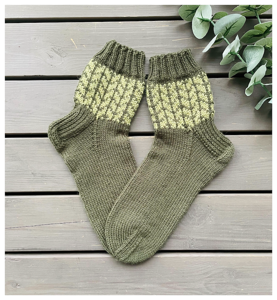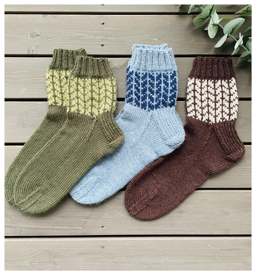 Helpot kirjoneulesukat miehelle! Sopii hyvin kirjoneuletta opettelevallekin, koska kuvio on helppo eikä sisällä pitkiä langanjuoksuja. Väriä vaihtamalla ilmekin sukissa muuttuu; voit tehdä koko miesväelle jokaiselle oman väriset sukat.