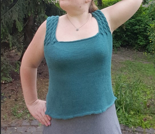 Johanna-toppi neulotaan alhaalta ylös yhtenä kappaleena kädenteille asti ja sen jälkeen olkaimet yksitellen tasona. Tässä topissa ei ole kappaleiden yhdistämistä, ainoastaan topin olkaimien kiinnitys takaosaan neulomalla.