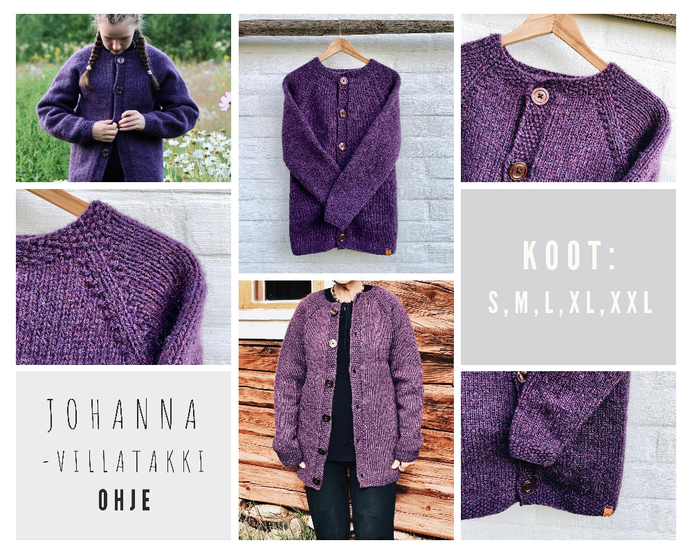Kaipaatko lämmintä villatakkia? Johanna on ihana ja ajaton. Mukava heittää päälle niin ulkoillessa kuin muissakin menoissa. Johannan miehusta ja hihat neulotaan alhaalta ylöspäin pyörönä. Miehustan resorit neulotaan edestakaisin. Yhdistä kainaloissa miehustan ja hihojen silmukat samalle pyöröpuikolle. Neulo myös kaarroke pyörönä. Kierros alkaa leikkuuvaraksi luoduista silmukoista.