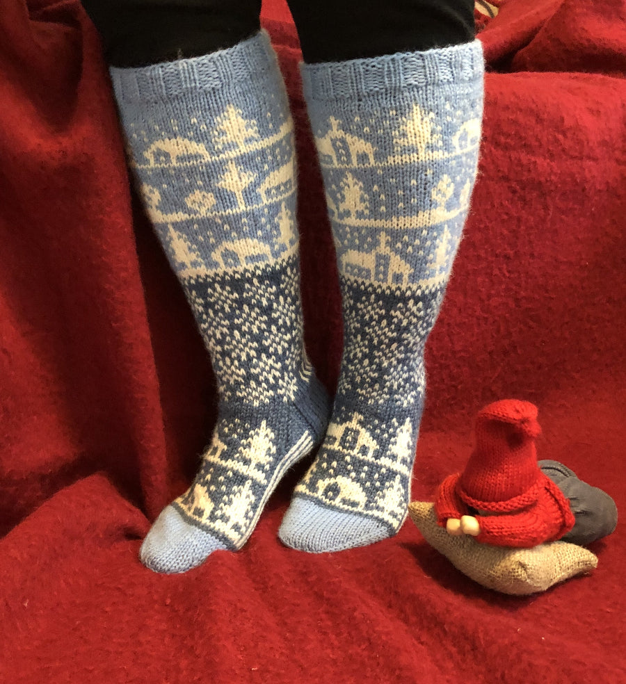 Jouluaamu-kirjoneulesukat, neuleohje (kuva Anneli Pulkkanen)