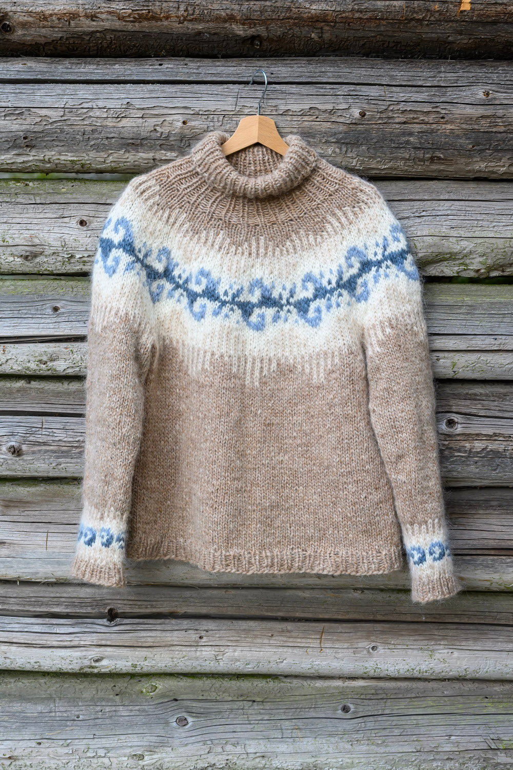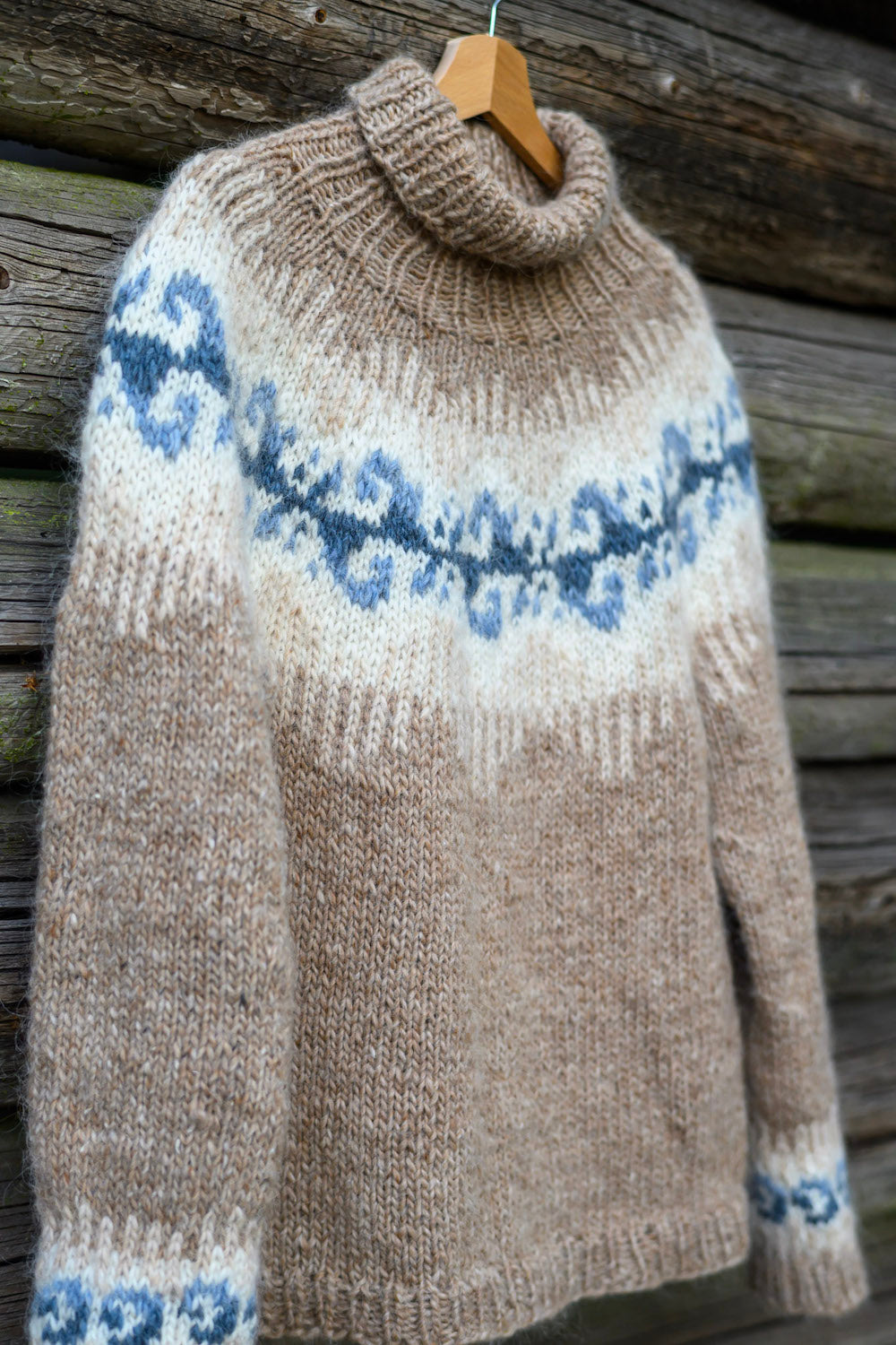Yhäältä alas neulottava kaarrokeneule. Pohjavärin lisäksi kuviossa on neljää eri kuvioväriä.