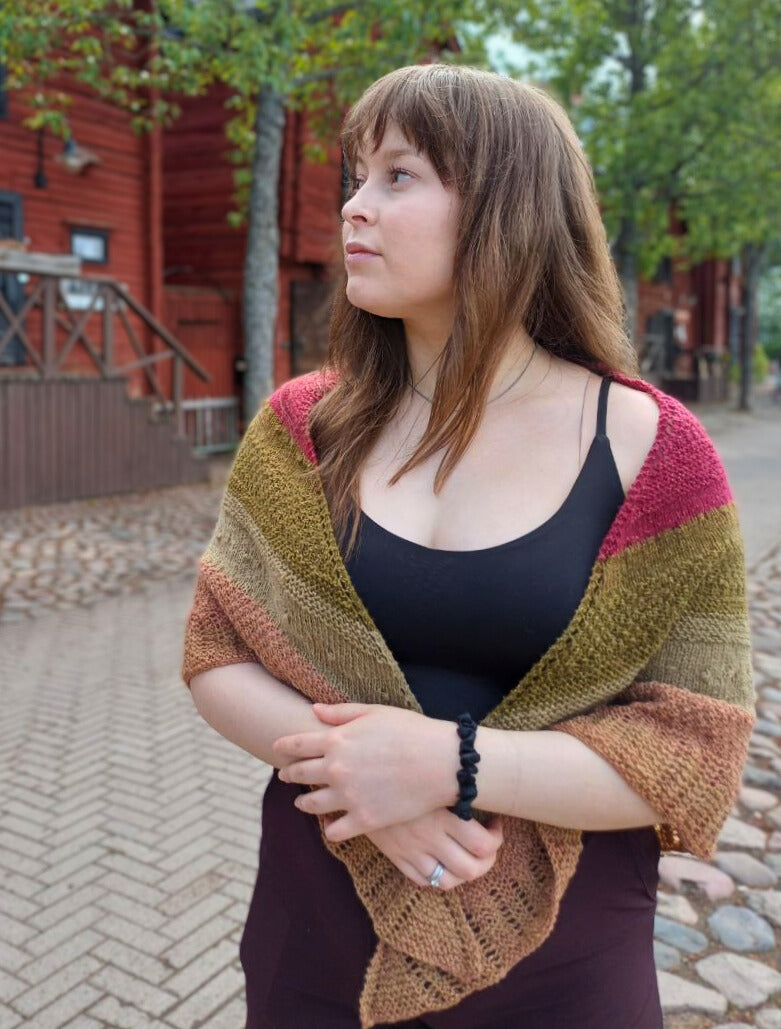 Koko: Yksi koko (valmiin neuleen mitat pingotuksen jälkeen: leveys 156 cm, korkeus keskikohdalta 70 cm)