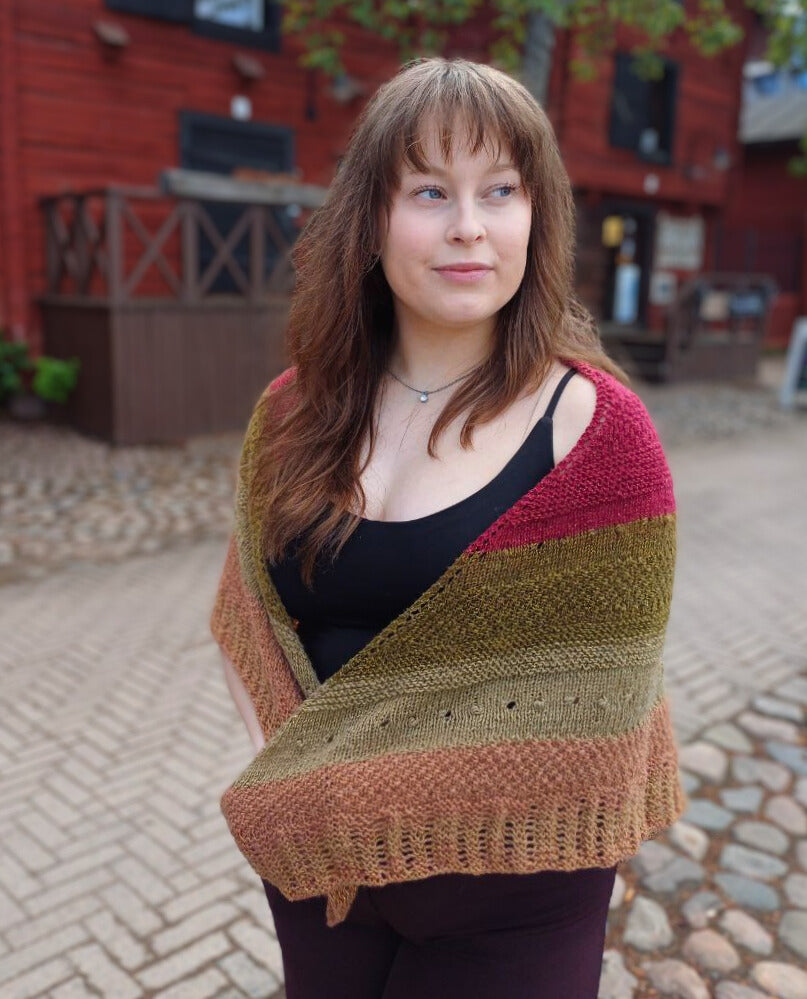 Huivissa käytetään kolmea eri pintaneuletta, sekä pitsineuletta luomaan elävyyttä sen kokonaisuuteen. Kolmiomainen muoto istuu kauniisti hartioille ja tuo lämpöä ja suojaa viileisiin iltoihin. Ohjeessa käytettävät pintaneuleet (aina oikein, pidennetty helmineule, sekä sileä neule) ovat helppoja toteuttaa, ja sileän kerroksen keskelle luodut nypyt ovat myös nopeasti opittavissa. Kokoa saa pienemmäksi tai isommaksi helposti vain lisäämällä tai vähentämällä kerrosten määrää.