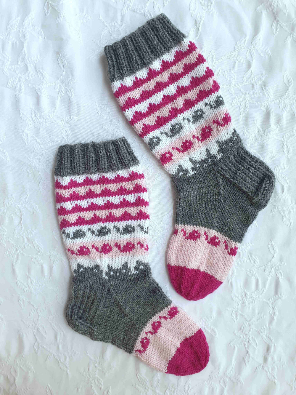 Koko: noin 38-40, yksi leveys varteen. Jalkaosaa voi neuloa sopivaan mittaan koossa 38-41.