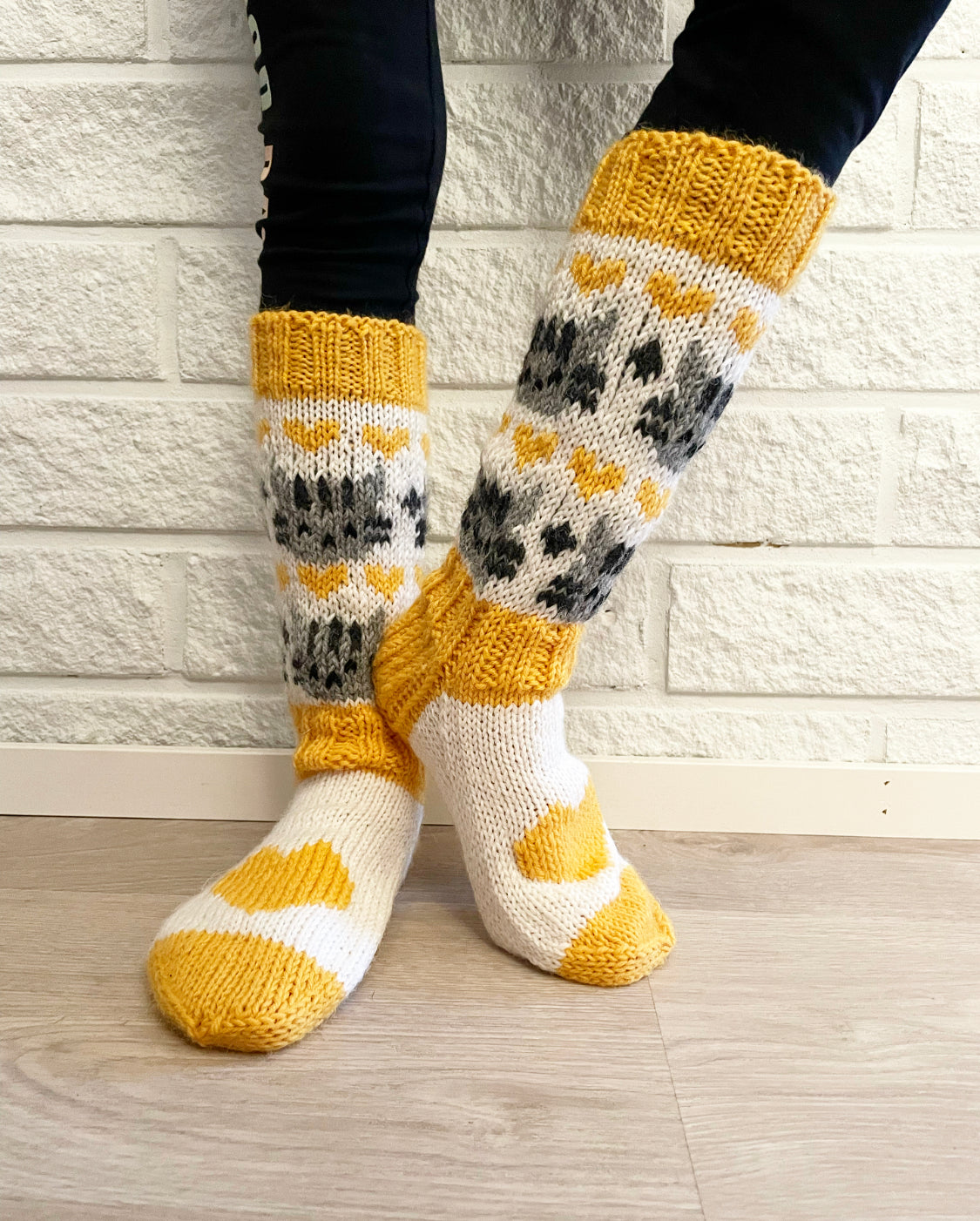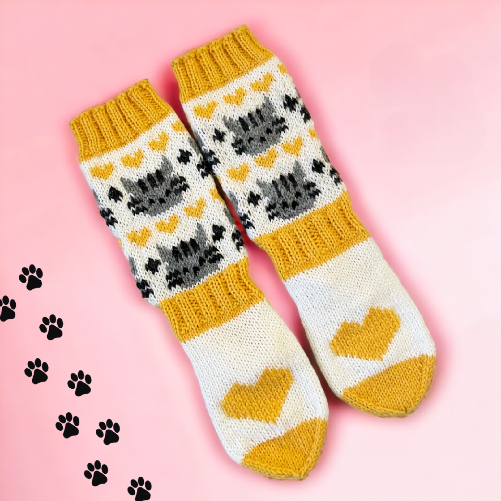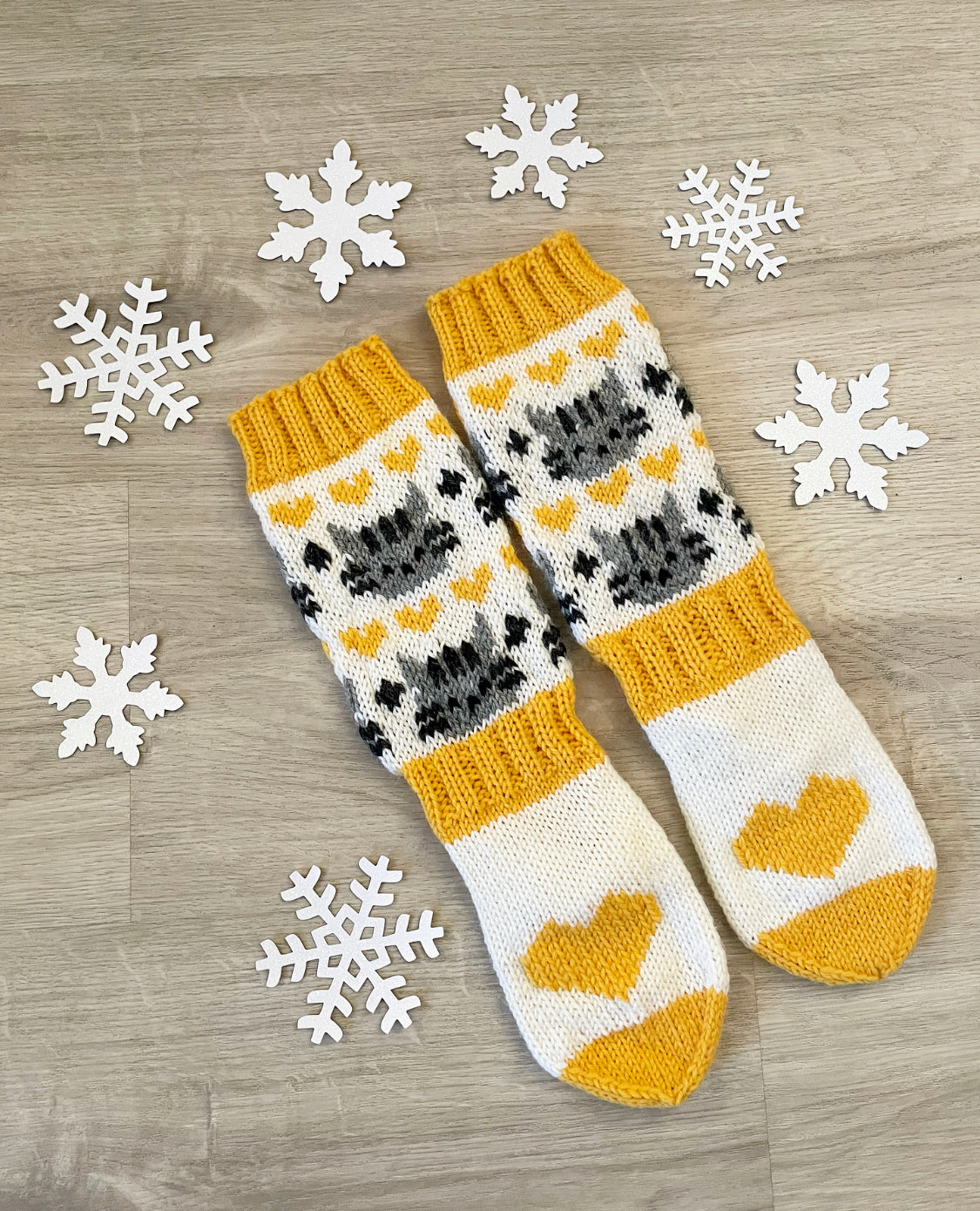 Kuka voisikaan vastustaa suloisia kissanpentuja! Kisut-villasukat ovat valmiina seikkailuihin, leikkeihin ja pitämään jalat lämpiminä. Varressa kissa-aiheinen kirjoneulekuvio, ja jalkapöydässä silmukoitu sydän.