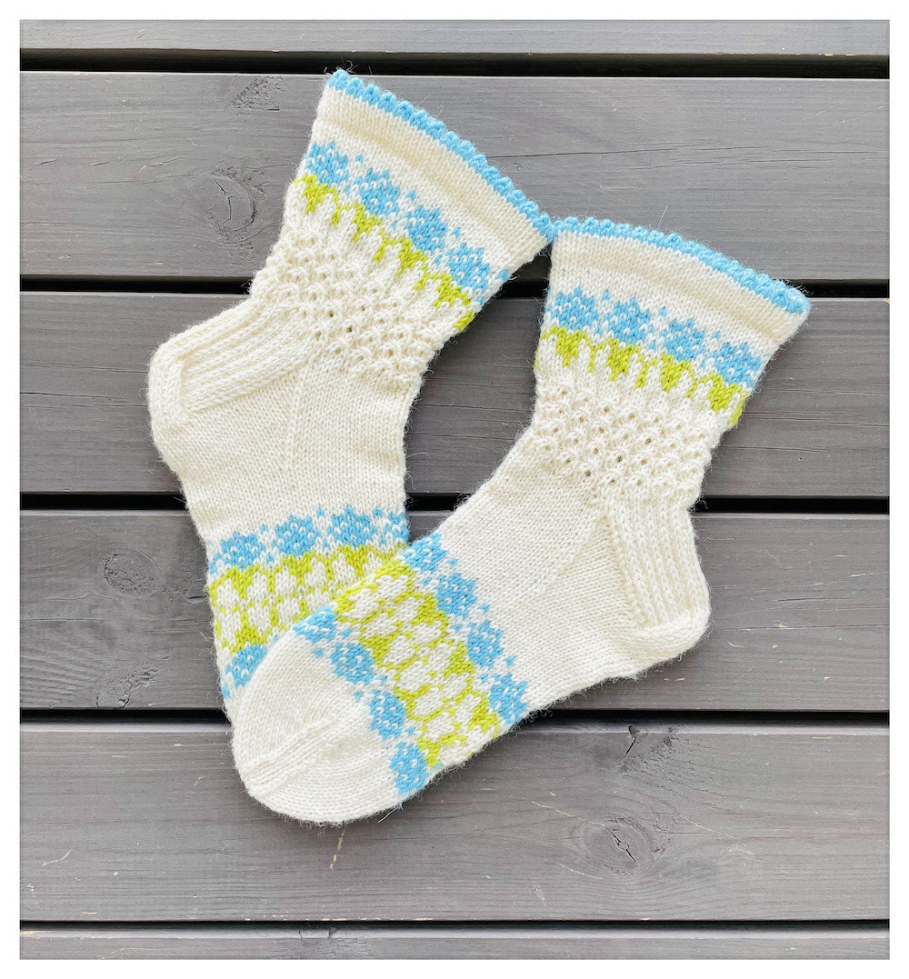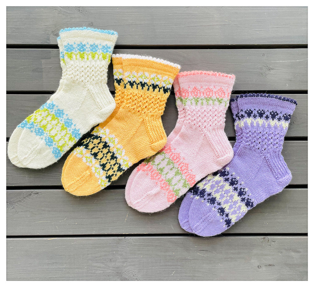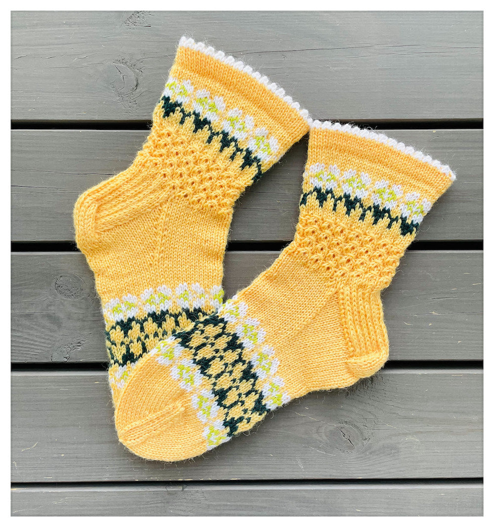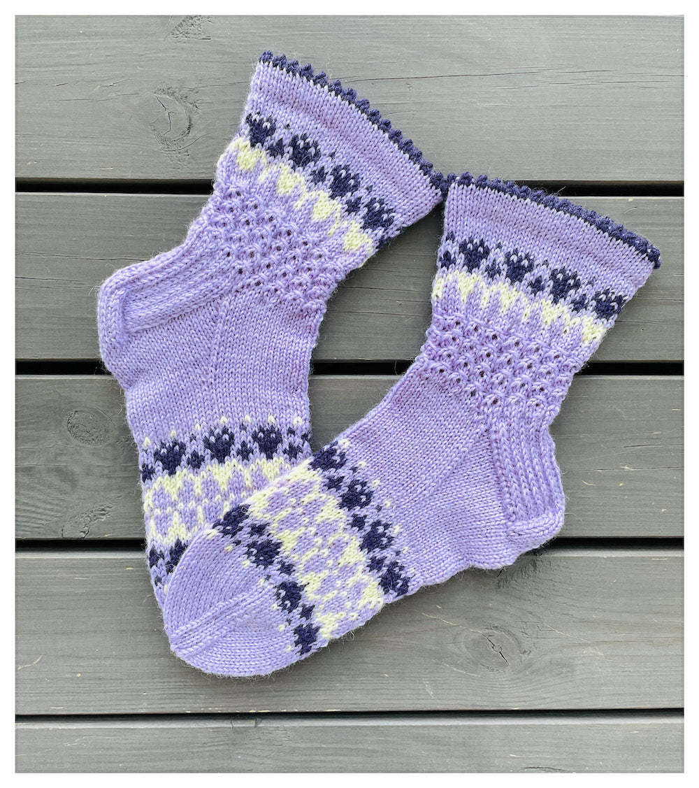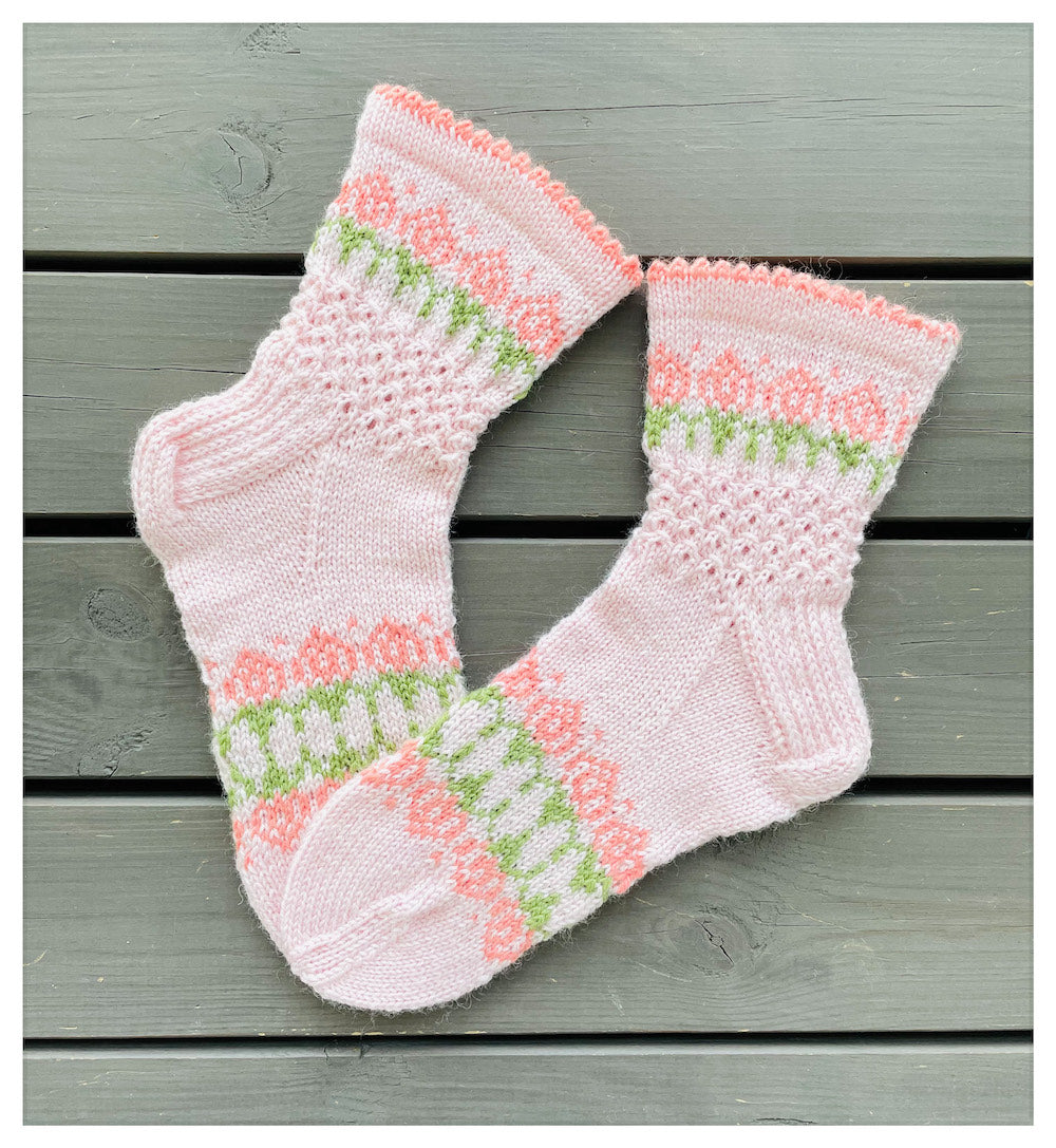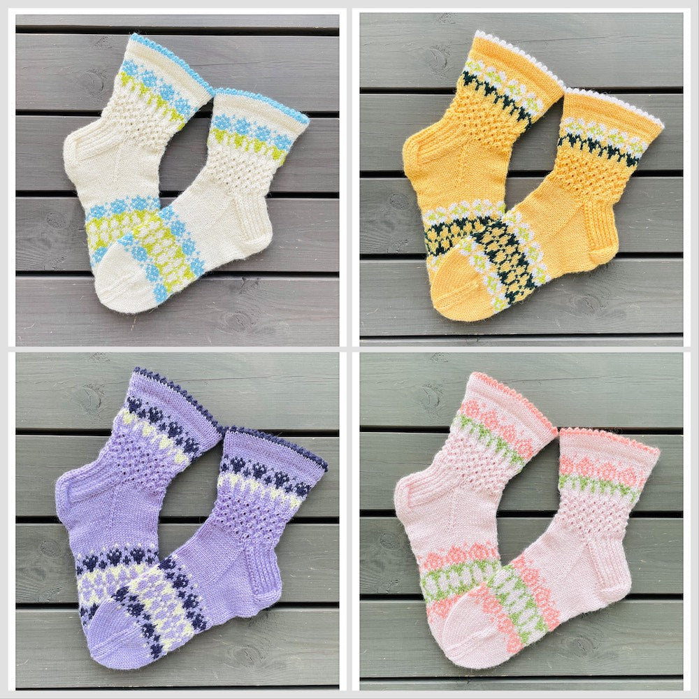 Kukkien vuorokausi-sukat, neuleohje (kuvat Irene Pöytäsaari)