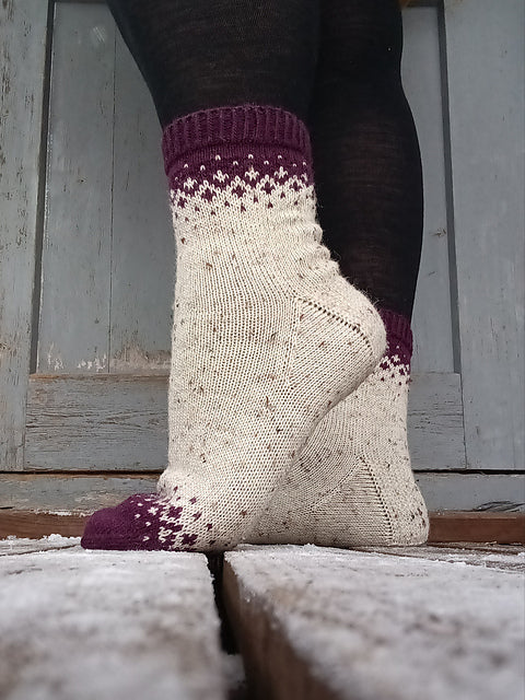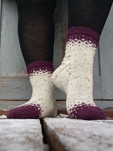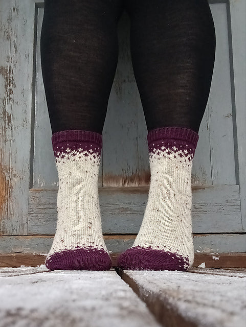 Kuura on klassinen sukkamalli jonka kärkeä ja varrensuuta koristaa yksinkertainen mutta näyttävä kirjoneulekuvio. Ohjeessa on ranskalainen kantapää ja se sopii myös aloitteleville kirjoneulojille.
