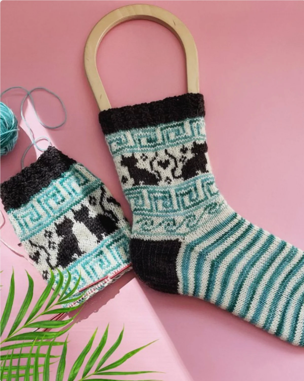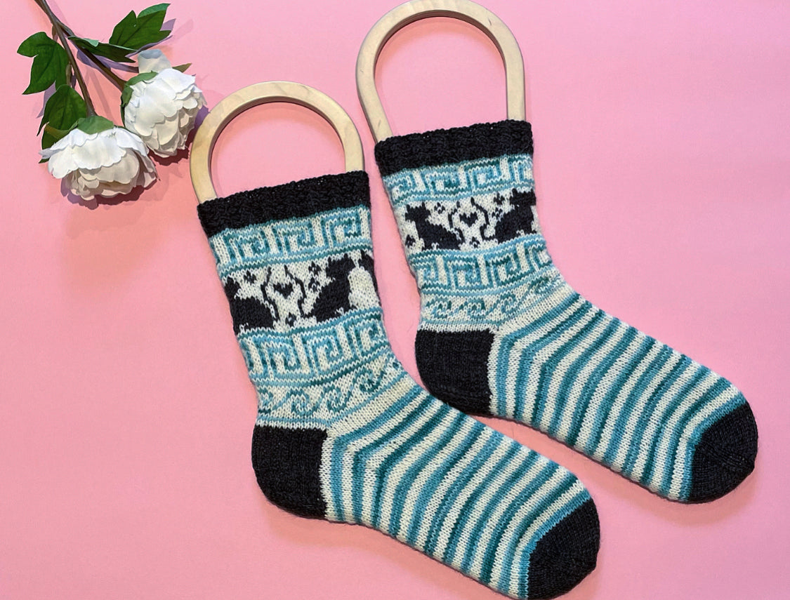 Nämä kirjoneulesukat sukat ovat saaneet inspiraationsa , nimensä mukaisesti, Kyproksen kissoista. Varressa on kreikkalaistyylinen kirjoneulekuvio, ja jalkaterä on raidallinen.