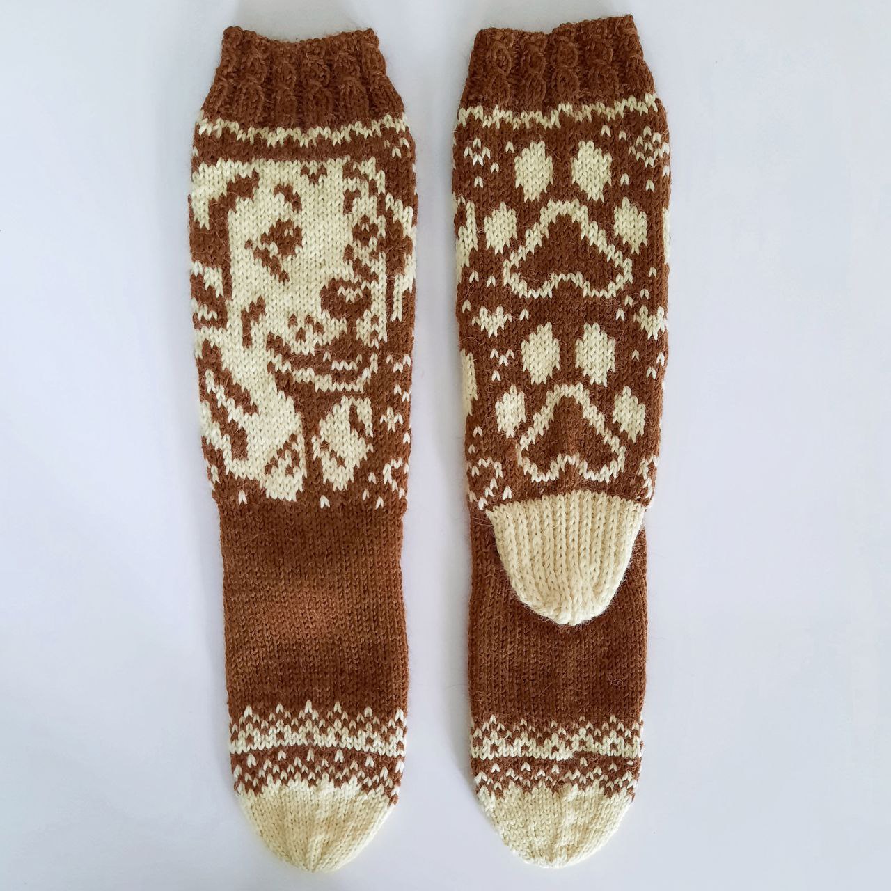 Labbis labradorinnoutaja kirjoneulesukissa toteutetaan varren kuvio tikapuutekniikan avulla.