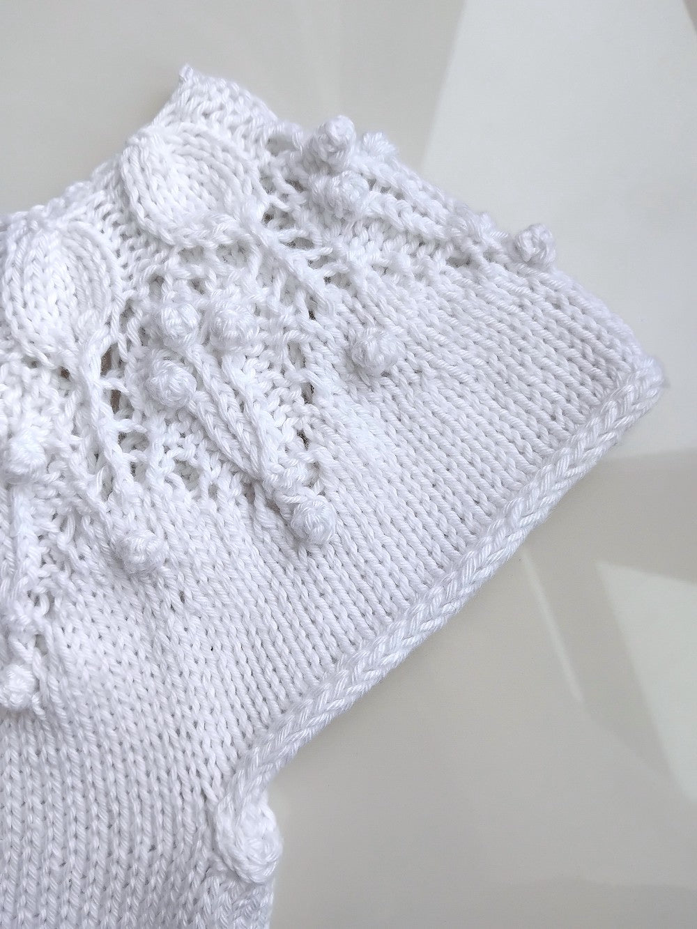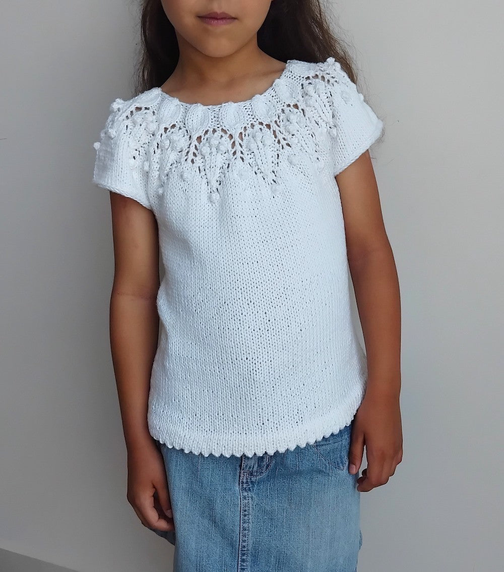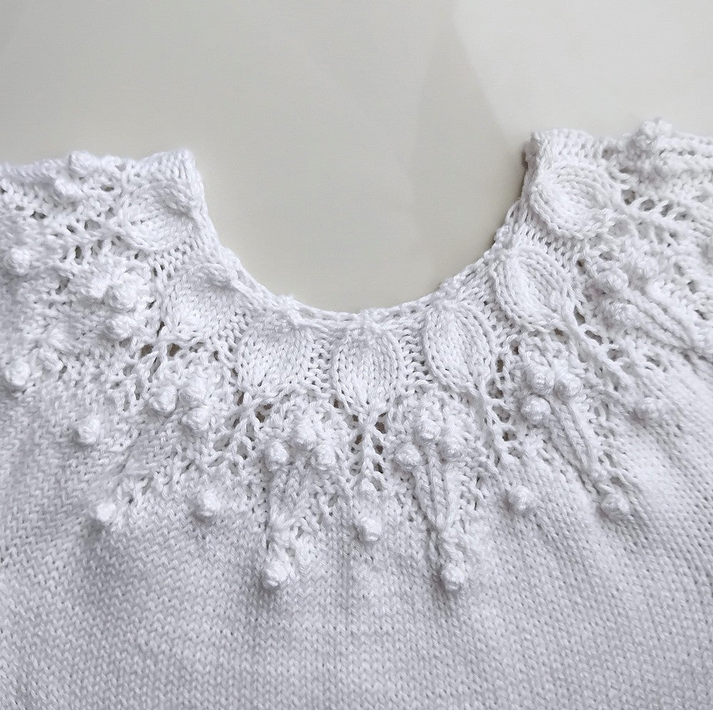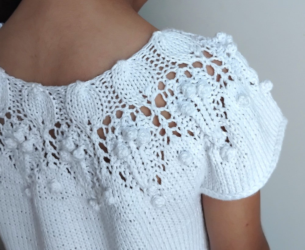 Neulotaan ylhäältä alas. Helma viimeistellään hiirenhammasreunuksella, ja hihat i cord -reunuksella.