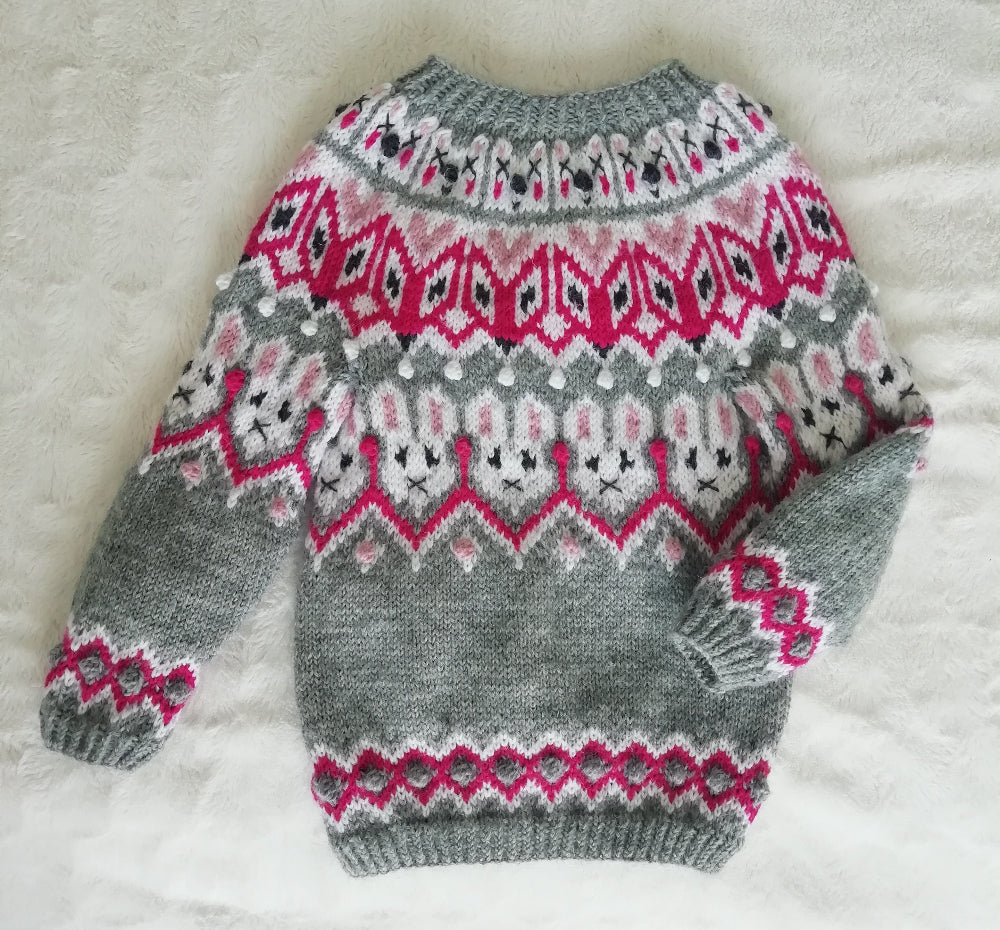 Vaikeusaste: Haastava. Pitkiä langanjuoksuja. Kirjoneuleosuudessa kuljetetaan useampaa eri väristä lankaa samoilla kerroksilla. Virkattuja nyppyjä. Kirjontaa.