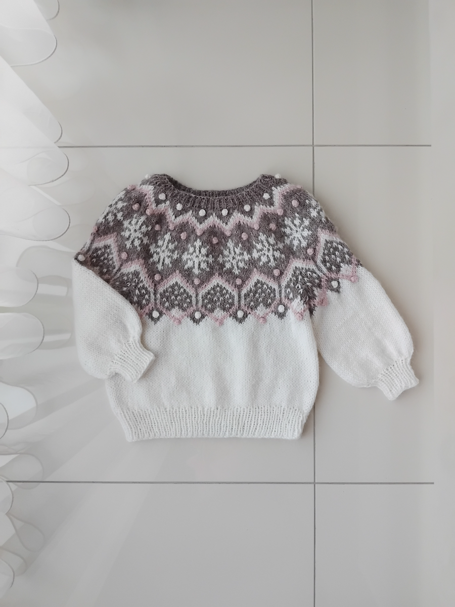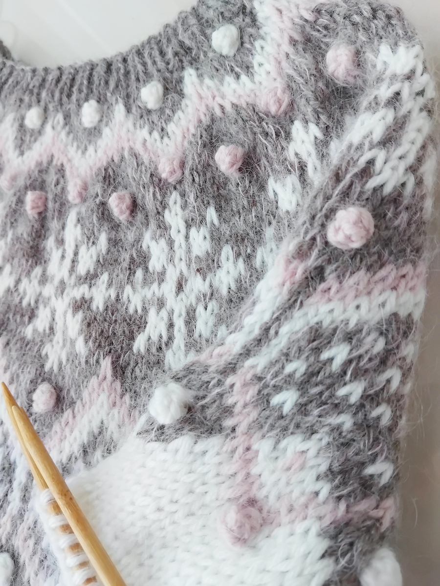 Vaikeusaste: Normaali. Kirjoneuleosuuksissa on jonkin verran pidempiä langanjuoksuja, ja osassa kuviota kuljetetaan kolmea eriväristä lankaa kierroksella. Nypyt tehdään virkkaamalla.