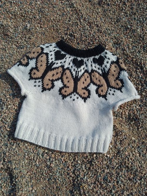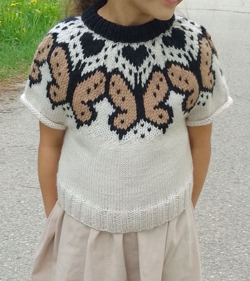 Lyhythihainen lasten kaarrokeneule, jossa myös hieman lyhyempi helma. Malli soveltuu loistavasti esimerkiksi mekkojen kaveriksi.