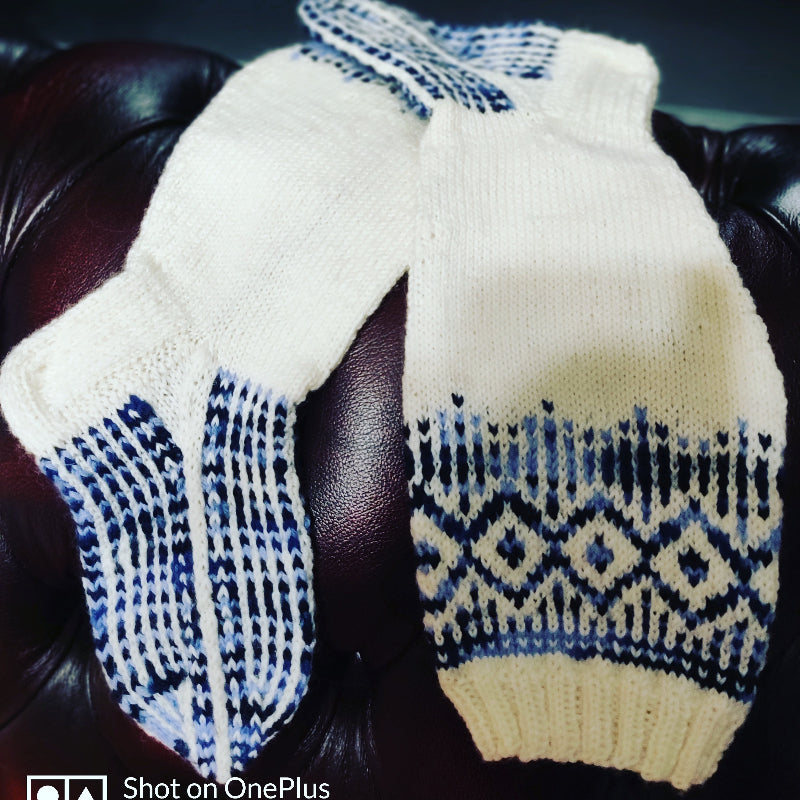 Linnanjuhlat-kirjoneulesukat, neuleohje (kuva Katja Makkonen)