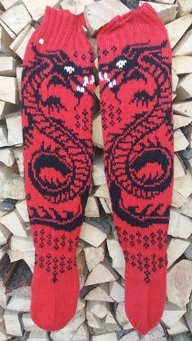 Lohikäärme-kirjoneulesukat, neuleohje (kuva Taina Huhtanen)