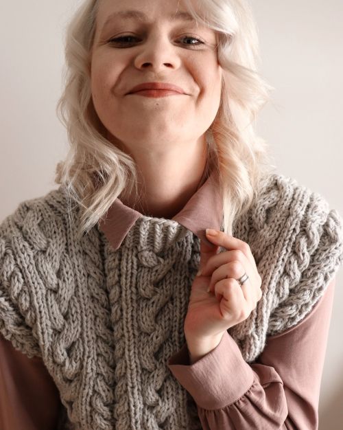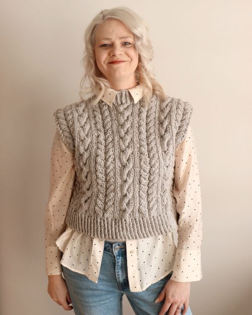 Luna neulotaan ylhäältä alas toistaen isoja palmikkokuviota koko työn ajan. Muhkean lämmin tupla DK-langalla neulottu villaliivi on kevät talven rakkauspakkaus, joka lämmittää sinua, kuin ihanan hento kevät aurinko.