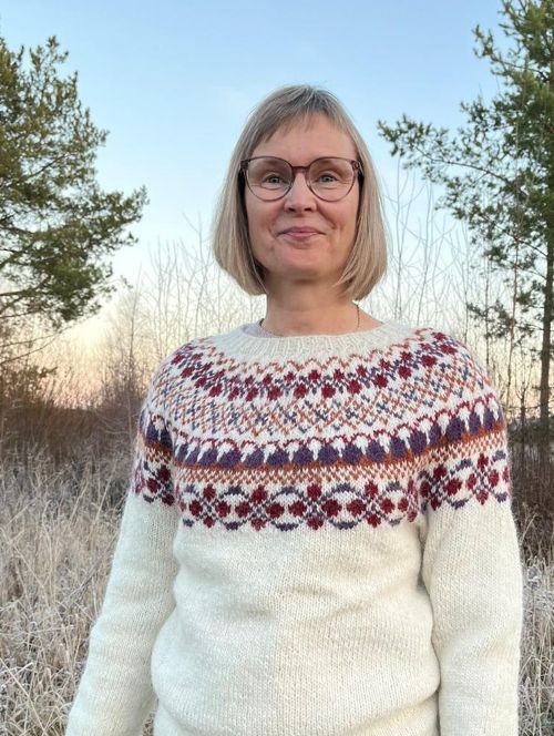 Vaikeusaste: Normaali; hieman silmukointia, kohtuullisen pituisia langanjuoksuja, max. 3 väriä samalla kierroksella.