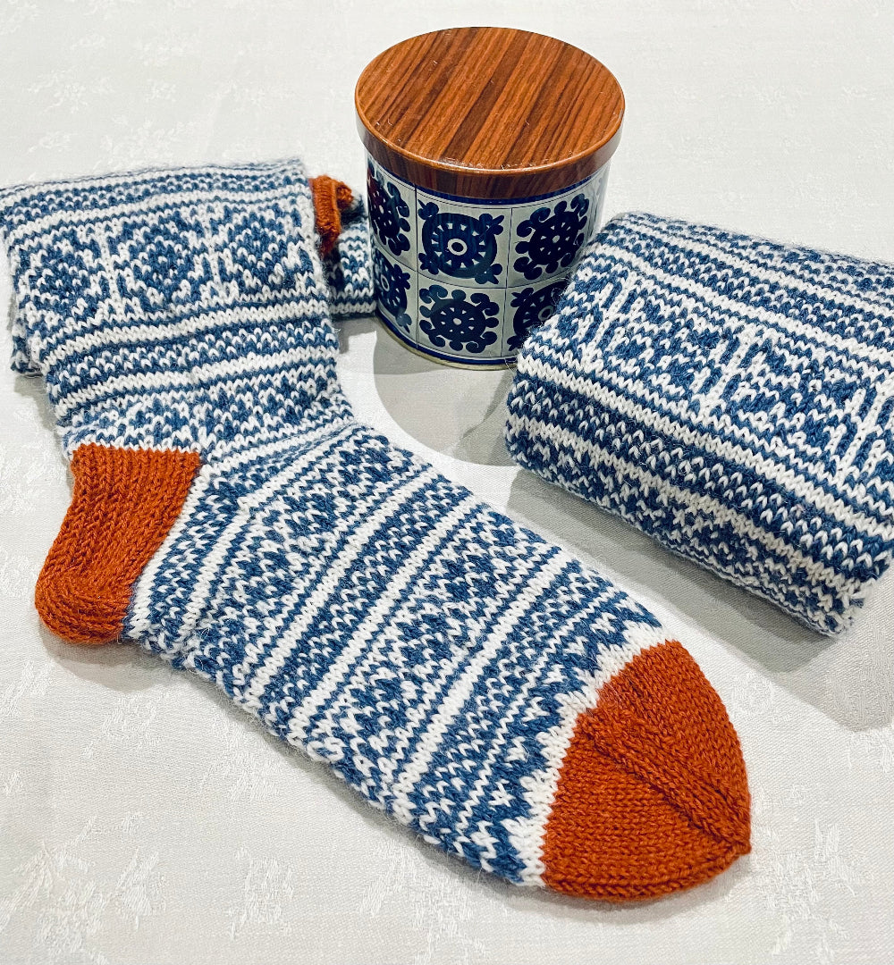 Vanhan Viri-kaakaopurkin inspiroimana menneen ajan lumoa henkivät pitkät kirjoneulesukat. Muistatko vielä lapsuudestasi sinivalkoisen purkin?