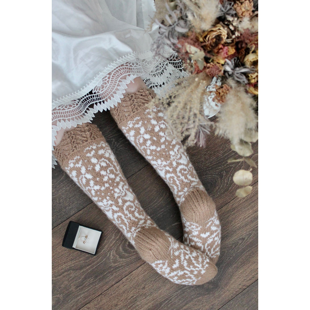 Koko: Kaksi kokoa aikuiselle naiselle, kapeampi ja (leveämpi) versio, sukan varren yläosassa 70 (80) s kerroksella (ennen kirjoneuleen alkua 76 (88) s, jalkaterän pituus 35/36 ja 38/39, pohkeen ympärys n. 36 (41) cm.