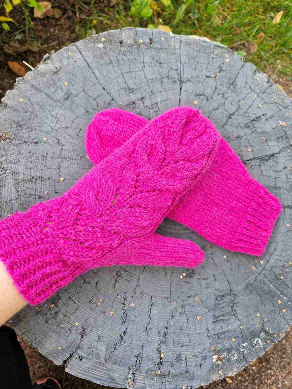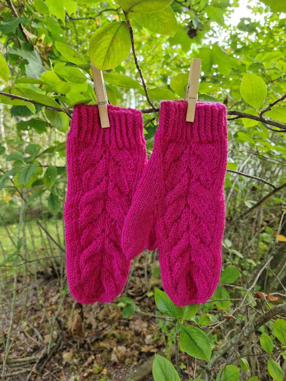 Puikot: 3,5 mm sukkapuikot tai käsialan mukaan. Kuvan lapaset on neulottu 3.5 mm puikoilla.