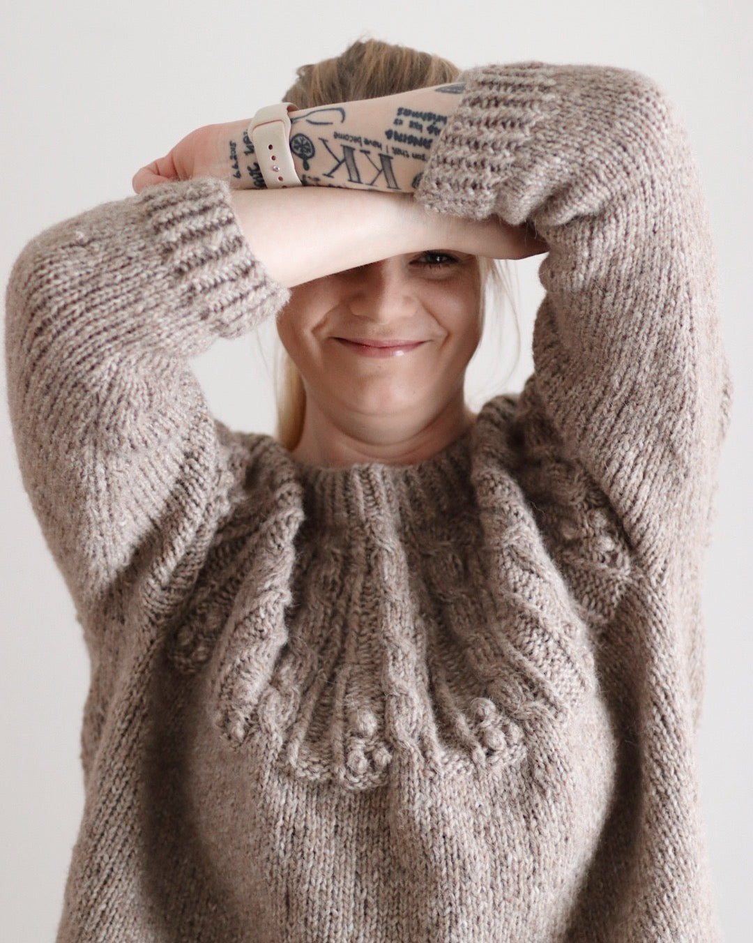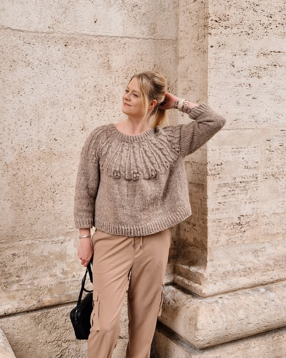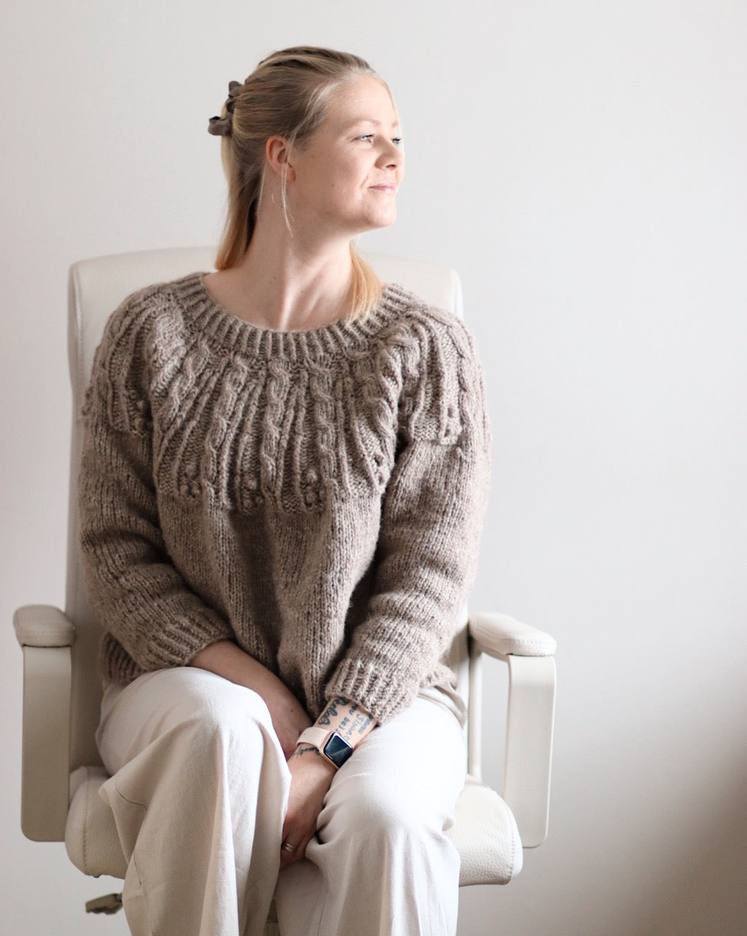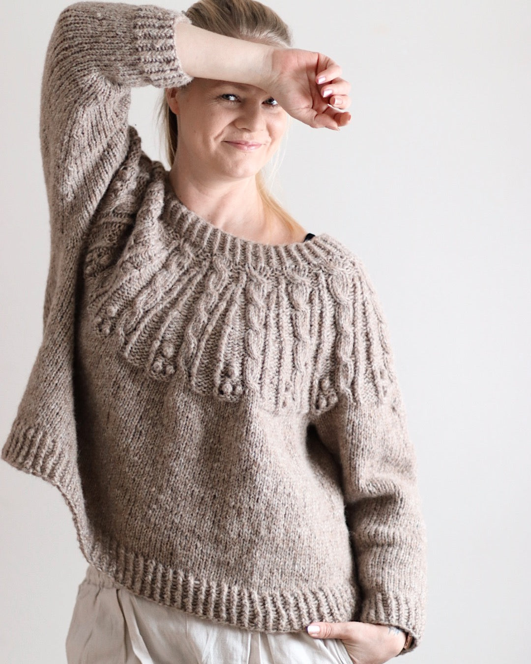 Muhkea ja pehmeä Moana neulotaan kauluksesta alaspäin ilman yhdisteltäviä saumoja.