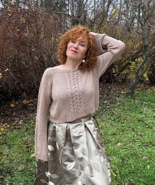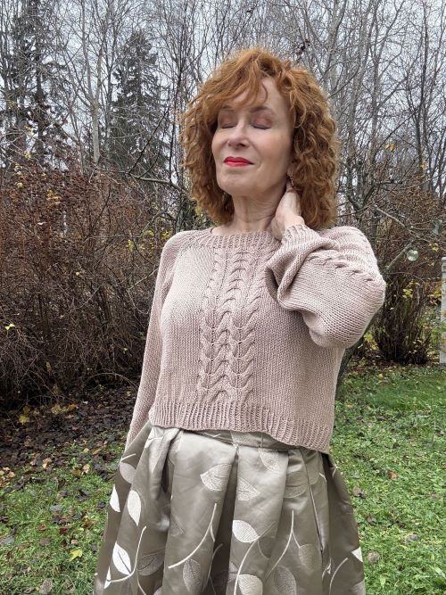 Viskoosineule tuntuu silkkisen pehmeältä ja sopii herkimmällekin iholle. Lisäksi siinä on kaunis kiilto. Neule on suunniteltu lyhyeksi ja hihat hiukan pitemmiksi, joten voit myös neuloa vyötärölle pituutta niin halutessasi ja jättää hihat lyhemmiksi.