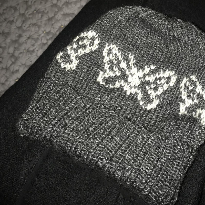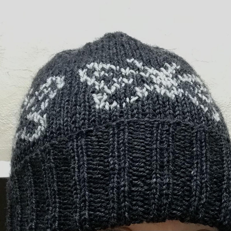 Kirjoneulepipo, jossa kuvio-osuus neulotaan heijastinlangalla.