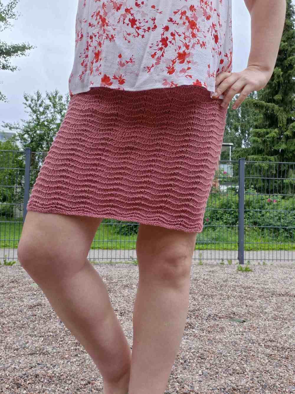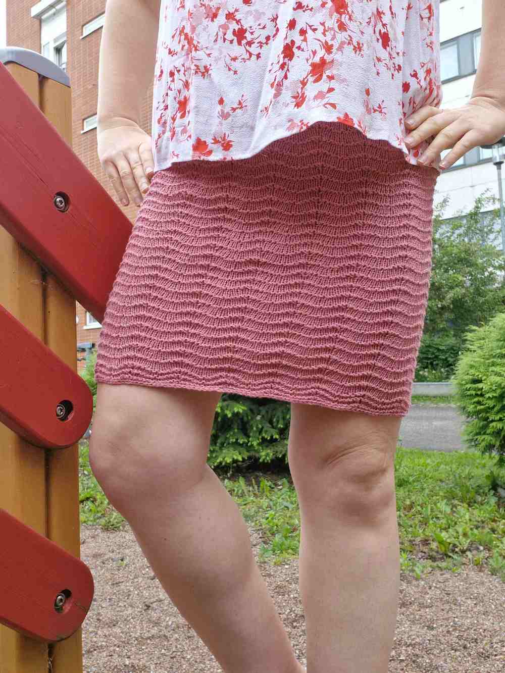 Tarvikkeet: Puikot 3-4 mm (60 cm) pyöröpuikot. Kuvan hame on neulottu 3 mm pyöröpuikolla ja on koossa L. Lisäksi tarvitset kuminauhaa hameen vyötärötaitteeseen.